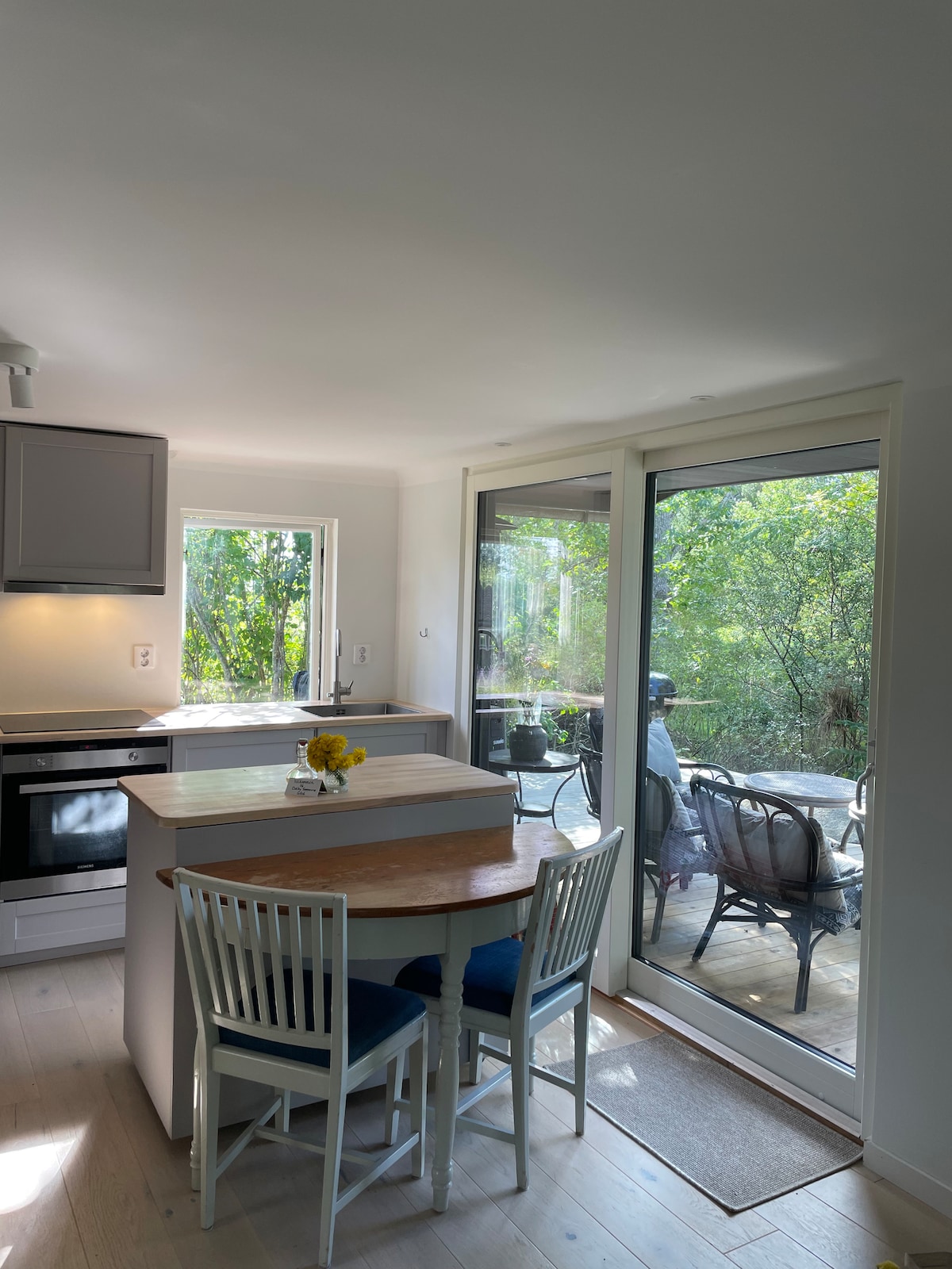We rent a spacious, bright and fully furnished 1 bedroom apartment of 52sqm in our house from the 70's. The apartment has its own entrance and is completely renovated with fine modern materials. The entire apartment is equipped with underfloor heating under the light gray concrete floor which extend through the entire apartment. New modern kitchen from Ballingslöv with everything you need to cook for one or more people. The apartment has an open floor plan.