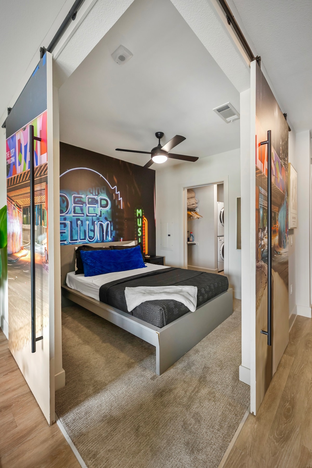 Bring the magic of the movies into your stay. This stylish Deep Ellum retreat features a private in-bedroom theatre setup, complete with a projector screen for cinematic nights in. Whether you’re streaming your favorite series, hosting a cozy movie marathon, or setting the vibe with music videos, the theatre space transforms your getaway into an experience. Located in the heart of Deep Ellum, you’ll be steps away from vibrant art, live music, dining, and all the VIBES!