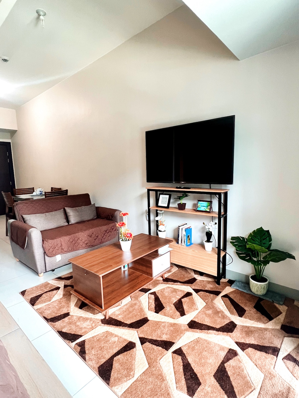 Styled & Managed by JQ PROPERTIES Urban location-tropical space. Airy and well-lit, decorated w/ lush & wooden items. Corner unit w/ full Manila Golf view. 1 Bedroom w/ Queen bed nook & single bed pullout & desk. Clean bathroom w/ hot water. Cozy living area w/ 2-seater sofa, Smart TV w/ Netflix, cable & fast 50mbps WIFI. 4-seater dining set. Fully equipped kitchen. Guest access to pool. Located at Burgos Circle, BGC. In front of groceries, surrounded by restaurants & shops.