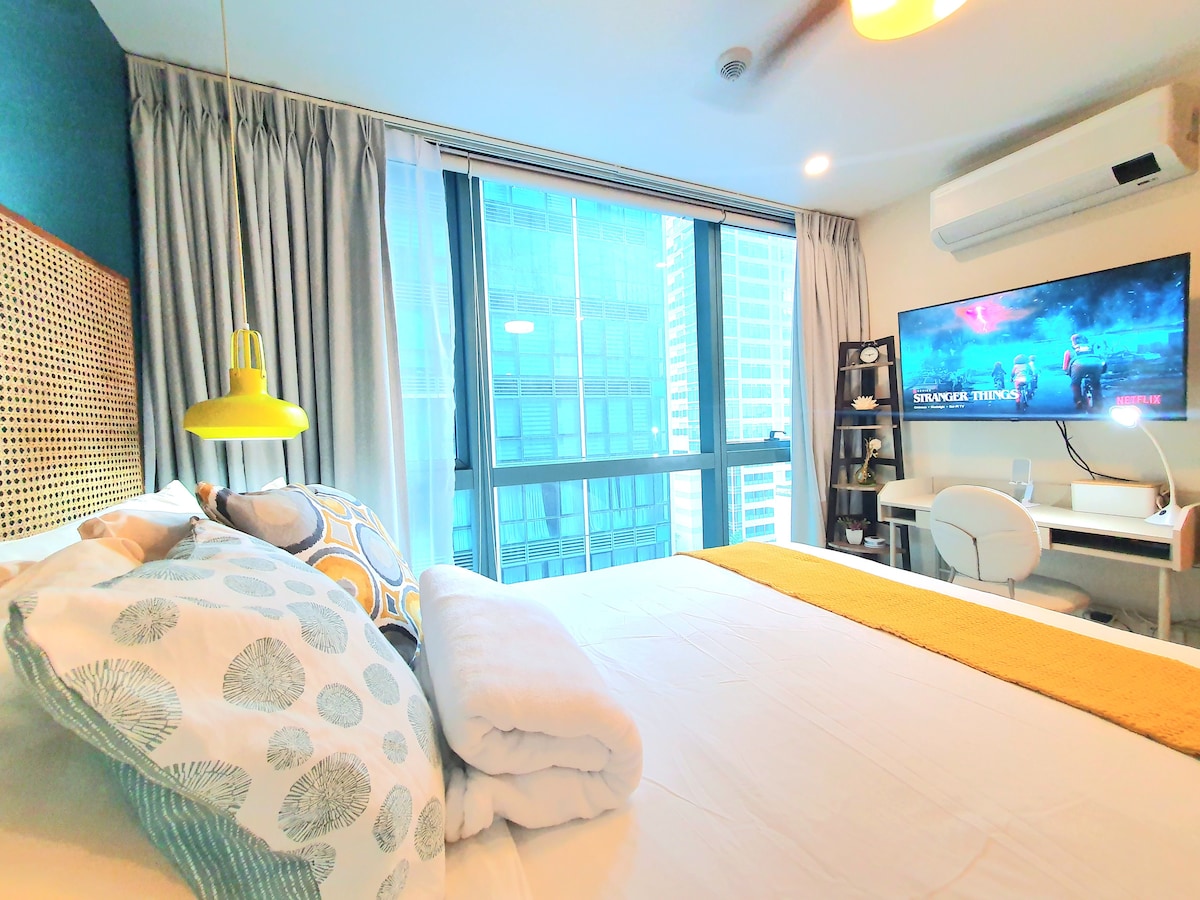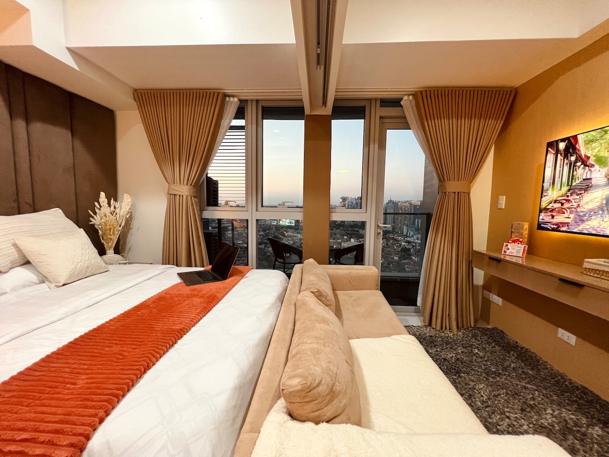 Book this luxury stay at the center of BGC. Everything is just a few steps away. Prime offices and high end malls surround Uptown Parksuites. Experience a cosmopolitan getaway at the Uptown Mall. Explore unique food and shopping concepts. Party the night away at premier bars right at your doorstep. Unwind in our Mid Century Modern bedroom unit. Comforts include a 55 inch SMART TV, 400 MBPS internet and a study area. Enjoy a comfortable and stylish experience at this centrally-located place.