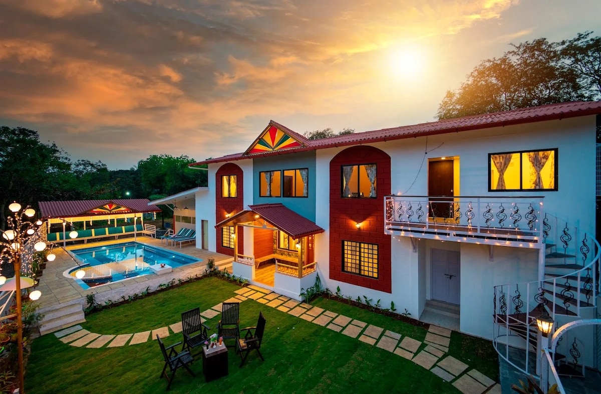 'Villa Elsewhere' is a luxurious, beautiful, private pool villa, just 60-90 mins drive from Mumbai. Surrounded by lush green views of fields, hills, and sounds of nature. The Villa has 3 AC en-suite bedrooms, a large AC living room that opens into a private pool and large deck with a Bar. The kitchen is fully equipped where a chef can make delicious meals (*extra charge). It is pet friendly (*extra fee). BOOK to relax in a calm peaceful vibe, for a get together, or to host the best part ever!