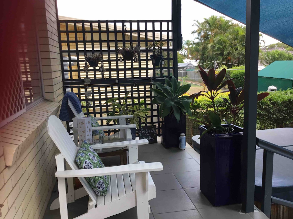 Your own self contained accommodation downstairs has a private entrance overlooking a lush courtyard and a few minutes drive from lovely Scarness Beach, restaurants ,hotels and shops.Guests can enjoy beautiful Bay views as they walk or cycle along a shady ten kilometer walkway from Vernon Point to the historical Urangan Pier. We are retired, social, travelled extensively, enjoy meeting new people and will help to make your visit as enjoyable as we can..We are LBGTQIA friendly