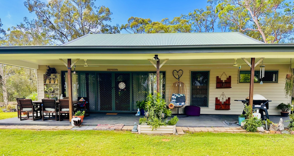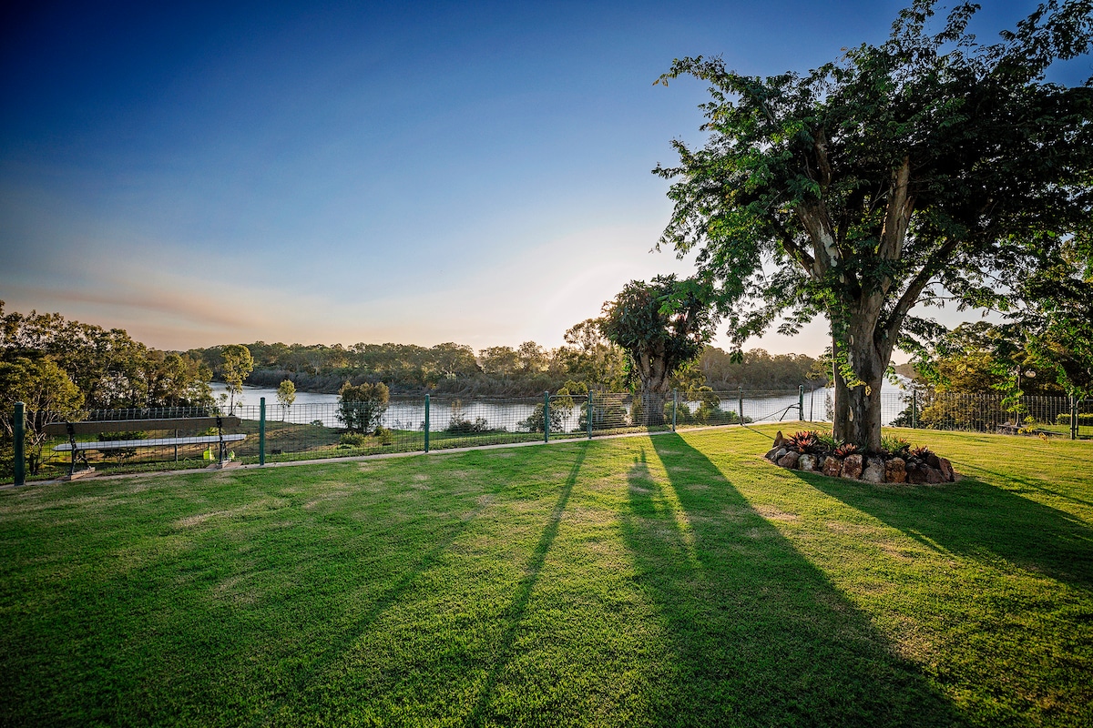 Just relax enjoying at beautiful river view overlooking Mary river and sugarcane fields on the front veranda. Just feel so free and chill out completely watching boats sail by with fantastic beautiful sunsets. Great for Honeymoons and families. Enjoy the lovely 7-acre gardens and fruit trees with river access and dams with birdlife. Have BBQ with outdoor sitting area or sit around the large fire pit. A peaceful quiet location between Maryborough and Hervey Bay in the peaceful river view.