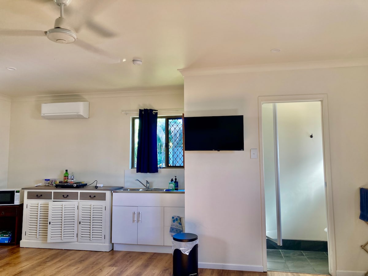 Welcome to our studio 😊 You will have the space to yourself- toilet/shower and tea/coffee pod making facilities and breakfast basics. Kitchenette including microwave, hot plates, pots and pans, fridge and toaster also provided. Air conditioning newly installed. Enjoy your own peaceful oasis a short five minute drive or fifteen minute walk to the beautiful Hervey Bay beaches and a short five minute walk to shopping and convenience stores. We have bikes to borrow and can help with any requests.