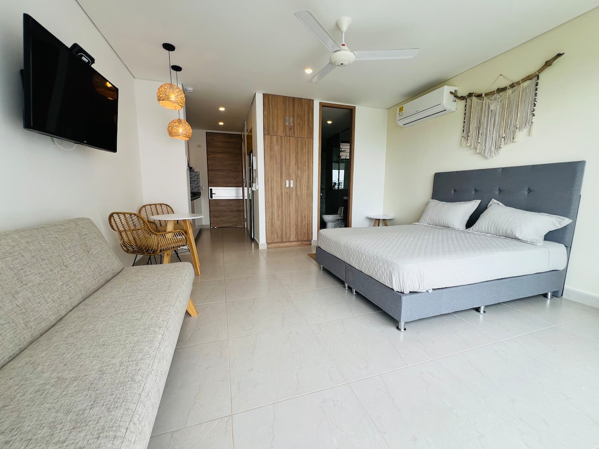 A *fully furnished modern suite* in Santa Marta just a short walk from Salguero Beach & close to El Rodadero, one of the city's most popular tourist spots. ✨ Highlights: Rooftop pool, Jacuzzis, Sauna, Turkish Bath, Game room, & Gym. MORE ⬇️. The building has free parking for visitors, subject to availability. The suite has a mountain view. Whether you're looking to unwind or explore, this suite is the perfect base for your time in Santa Marta.