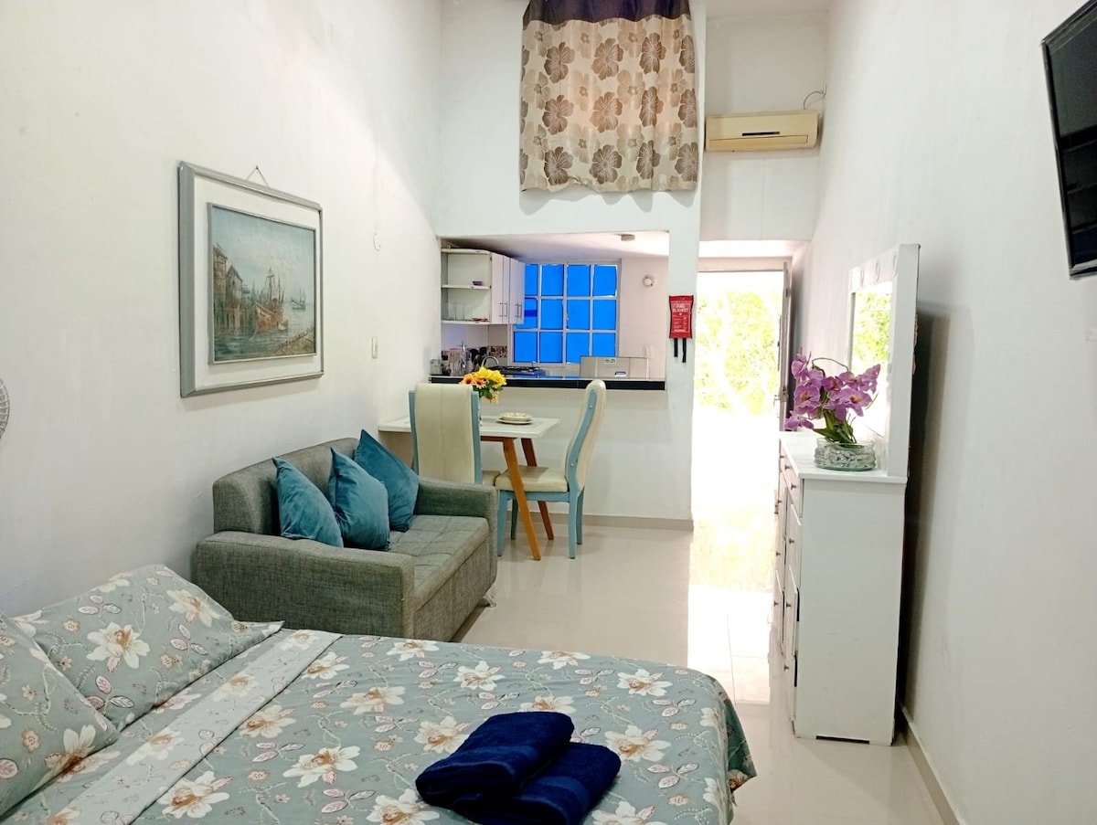 Disfruta tu estadía en Taganga con una maravillosa vista a la bahía rodeado de naturaleza. Apartamento de un espacio en primer piso con baño privado, cocina, sala y aire acondicionado, muy espacioso y super tranquilo, contamos con una terraza común en piso superior con vista. (La habitación no tiene vista directamente al mar) Relájate en este tranquilo lugar lejos del ruido y a 500 metros de la playa, donde puedes disfrutar tu desayuno con una excelente vista al mar.