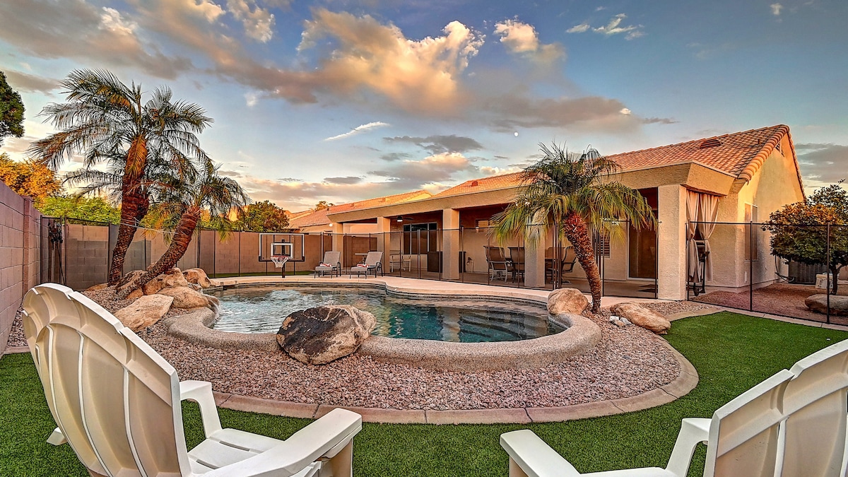 Separate-entry, private suite with self check-in less than 10 minutes to State Farm Stadium, MLB Spring Training at the Peoria Sports Complex, P83 dining and entertainment, Westgate, Desert Diamond Casino & 18 hole golf course at Palmbrook Golf Club. Enjoy pool, hot tub, cabana, fire pit, putting green, private courtyard & gated park access. Inside: new Nectar memory foam queen bed, fireplace, WiFi, Smart TV, massage recliners, desk, mini-fridge, microwave, air fryer, toaster & Keurig.