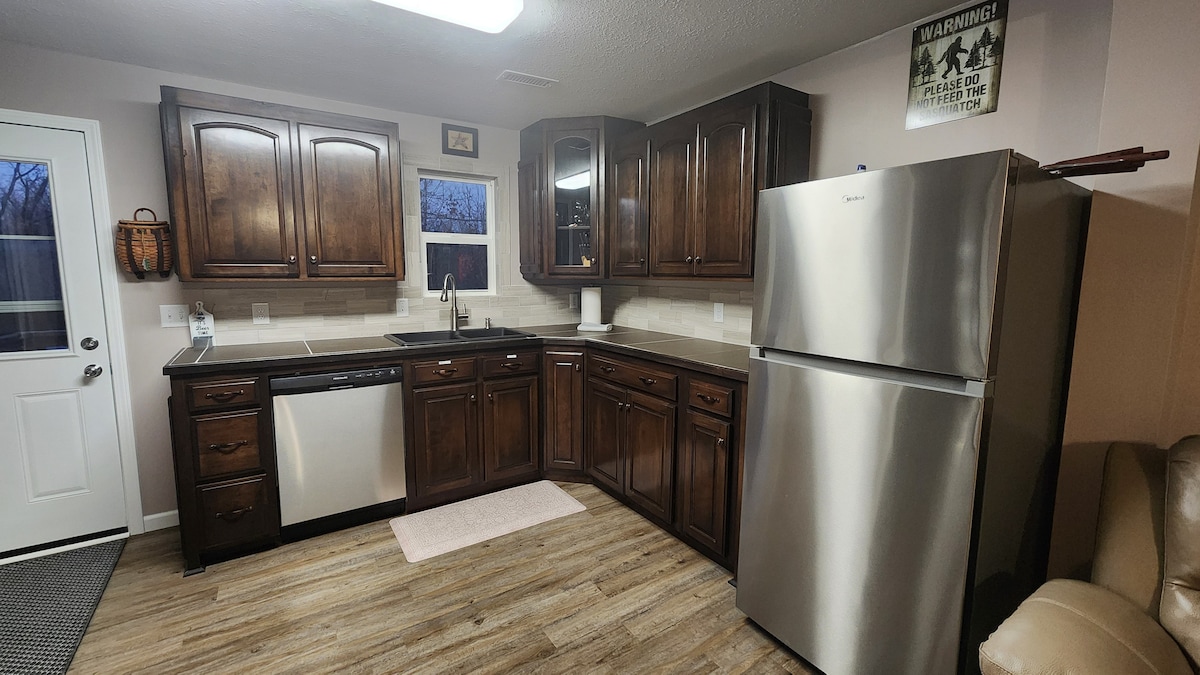 This cozy cottage in the woods (completed in June 2017) is perfect for a couple seeking a romantic getaway, enjoying a honeymoon, or celebrating an anniversary. (The sofa is a full convertible bed, if others plan to share the 400+ sq. ft. space.) Located in the Lake Hill (formerly Shadow Lake) Golf Course neighborhood (course is currently closed) about a mile from the NW shores of beautiful Pomme de Terre Lake, and about 6 miles south of Lucas Oil Speedway.