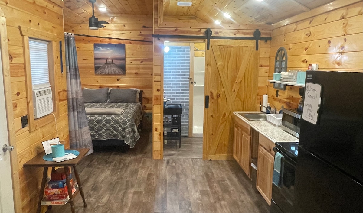 Enjoy a delightful modern stay at this unique tiny house. This home is fully equipped with a complete kitchen, living space, bedroom, and full bathroom. For a tiny home this place is impressively roomy! There's ample parking as well as an adorable front porch overlooking a gorgeous yard surrounded by woods. Conveniently located, perfect for couples or singles, amazing atmosphere indoors and out.