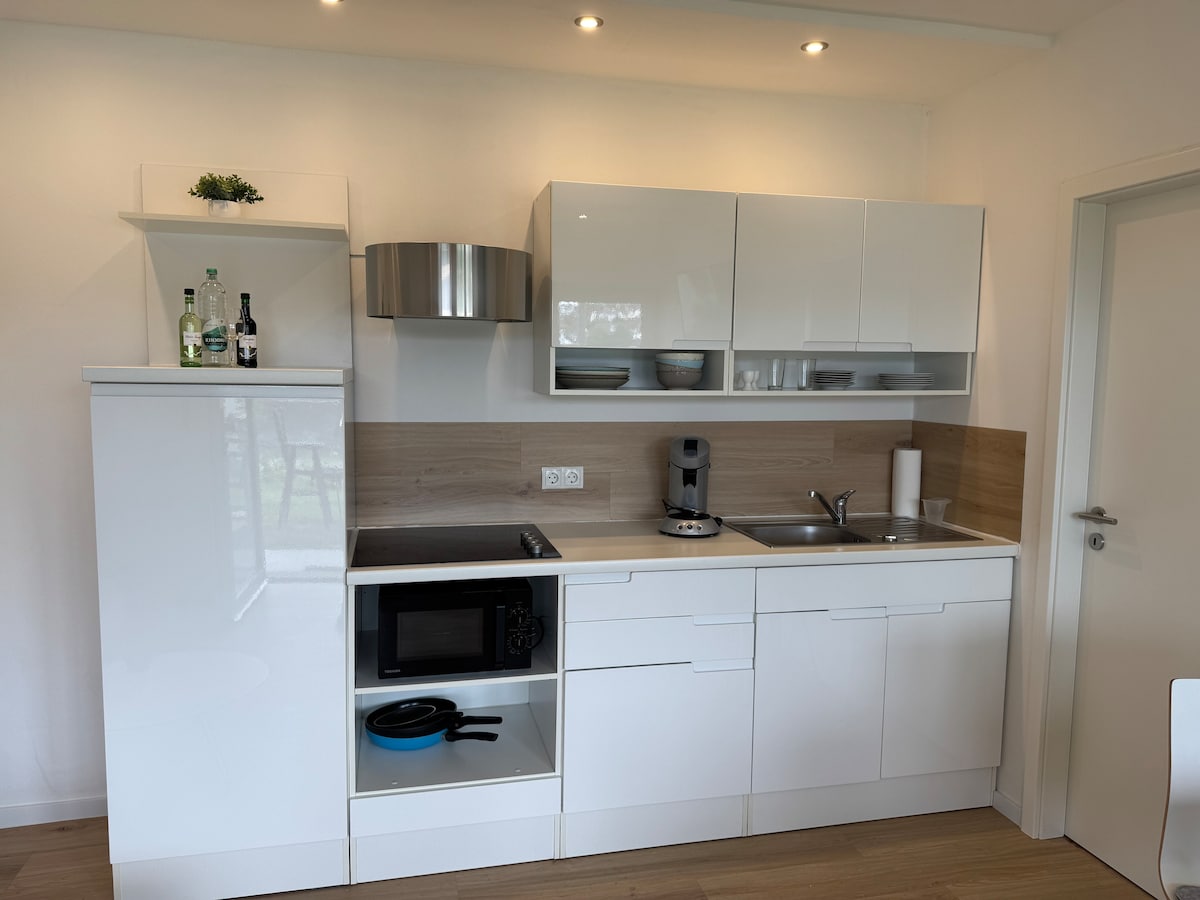 Stilvolles, helles Apartment auf historischem Gut in der Natur und doch stadtnah. Mitten im Landschaftsschutzgebiet, umgeben von Wald und Wiese, liegt das idyllische Anwesen aus dem 16. Jahrhundert. Das offene Apartment mit Galerie bietet ausreichend Platz für 4 Personen. Es verfügt über einen eigenen Eingang mit Terrasse und befindet sich im 1. Obergeschoss des Mittelbaus des Hofes. Die helle Wohnküche mit antiken Möbeln und praktischer Kochzeile lädt zum Kochen, Essen und Beisammensein ein.