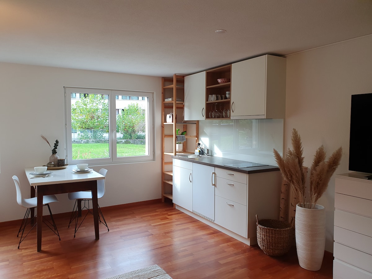 Dear Guest It awaits you a modern, partly renovated, ready-furnished 1.5 room space (approx. 35m2) + secondary storage room in the top floor of a 3-story property with a dedicated stairway (if you are not comfortable with stairs: there is no elevator ;-). The property is beautifully situated on a slope, embedded by green nature. The space radiates a dreamy Scandinavian lightness. The roof-slope adds spaciousness & air to the atmosphere. Here we invite you cordially to relax & enjoy yourselves!
