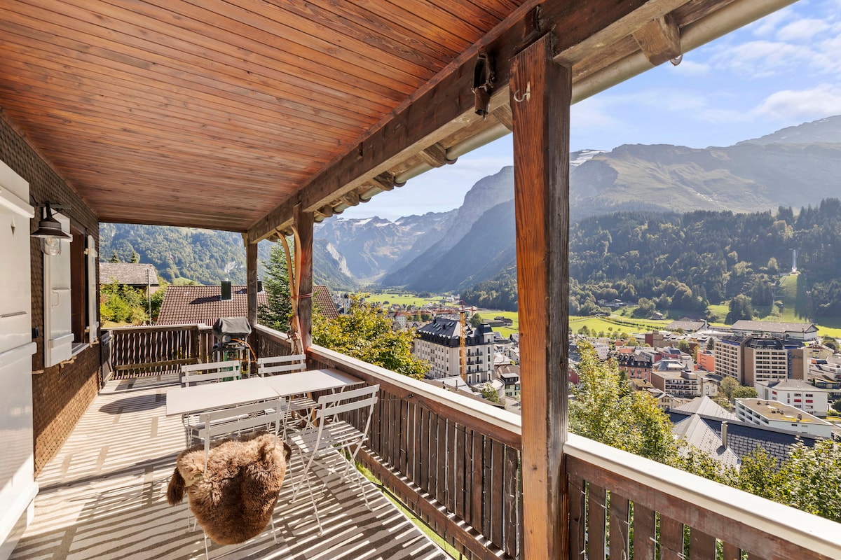 Our Chalet is situated on the sunny side of Engelberg and offers a spectacular 180 degree view of mountains (including Titlis), the valley, the village and the monastery. We just renovated the old wooden Chalet in a Scandinavian Look with lots of love. We hope you appreciate the spacious and well equipped kitchen and all the stylish details of the Chalets as much as we do. We don't have a parking space, but there is a public parking space not far to it. It takes you 5-10minutes to walk there.