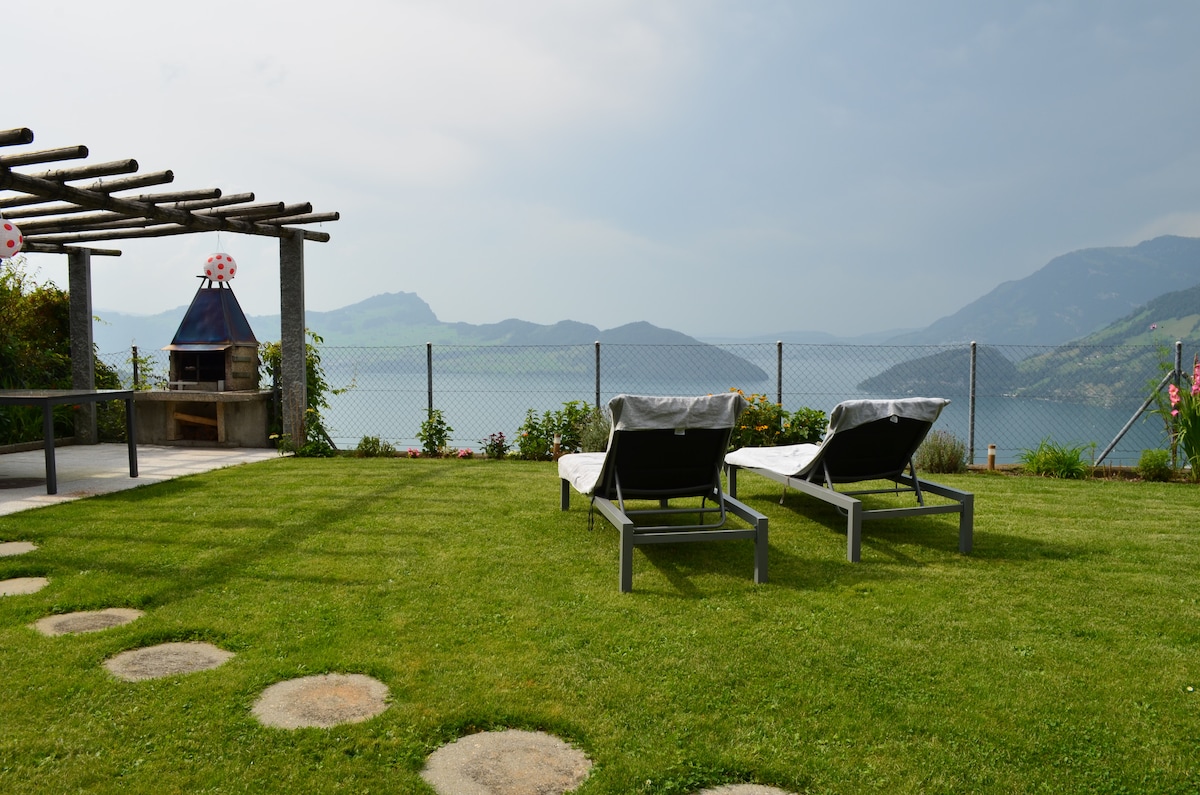 Traumhaftes Chalet in sehr rugiher Umgebung mit Blick über den Vierwaldstädtersee und in die Berge. Es bedarf einer 15 minütigen Wanderung auf den idyllischen Naturtreppen des „Weg der Schweiz“ Öffentliche Parkplätze gibt es im Dorfkern von dort ab geht es zu Fuss weiter. Ein Rucksack ist absolut zu empfehlen und Koffer sind gar nicht geeignet. Im Mini-Laden im Keller kann man ein paar haltbare Dinge kaufen oder wieder ersetzen.