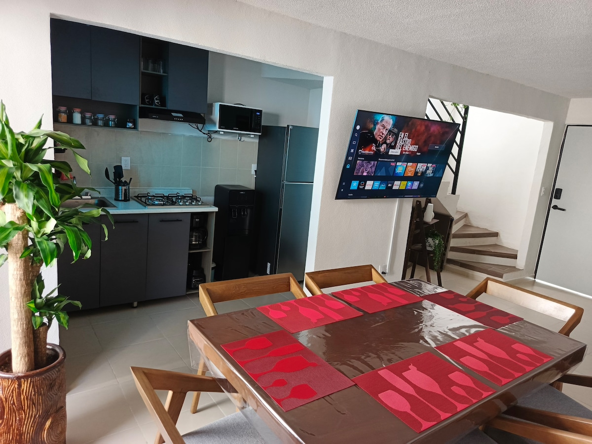 Departamento a 2 cuadras del jardin principal Ubicado dentro de complejo familiar Cuenta con cochera para 1 auto 2 habitaciones (cama king size y matrimonial) 2 baños completos 2 medio baños Ventiladores Sala Pantalla de TV Comedor para 6 personas Refrigerador Estufa Microondas Cafetera Licuadora Bateria de cocina Losa Utencilios de cocina Plancha y burro para planchar ropa