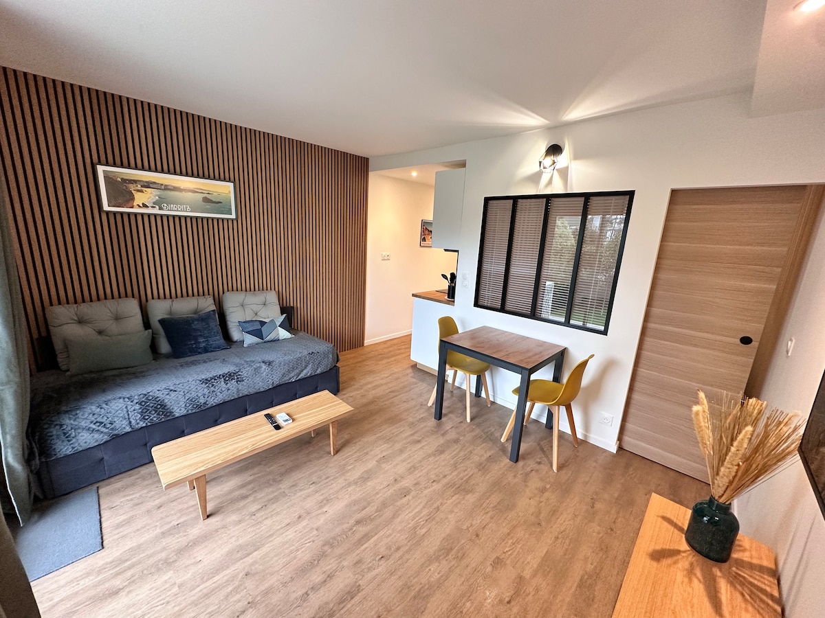 Location estivale Dans un cadre de verdure, proche du lac Mouriscot, charmante maisonnette de 22 m2 . Coin cuisine: plaque induction, frigo, micro-ondes, lave-linge, cafetière, bouilloire, fer à repasser. Lit en 160 X 200 Wifi. Jardin avec salon d’extérieur. Stationnement facile devant la maison. Accès aisé aux plages de la Milady et d’Ilbaritz à pied ou en vélo à 1,5 km par le lac Mouriscot. Centre-ville de Biarritz à 5 minutes