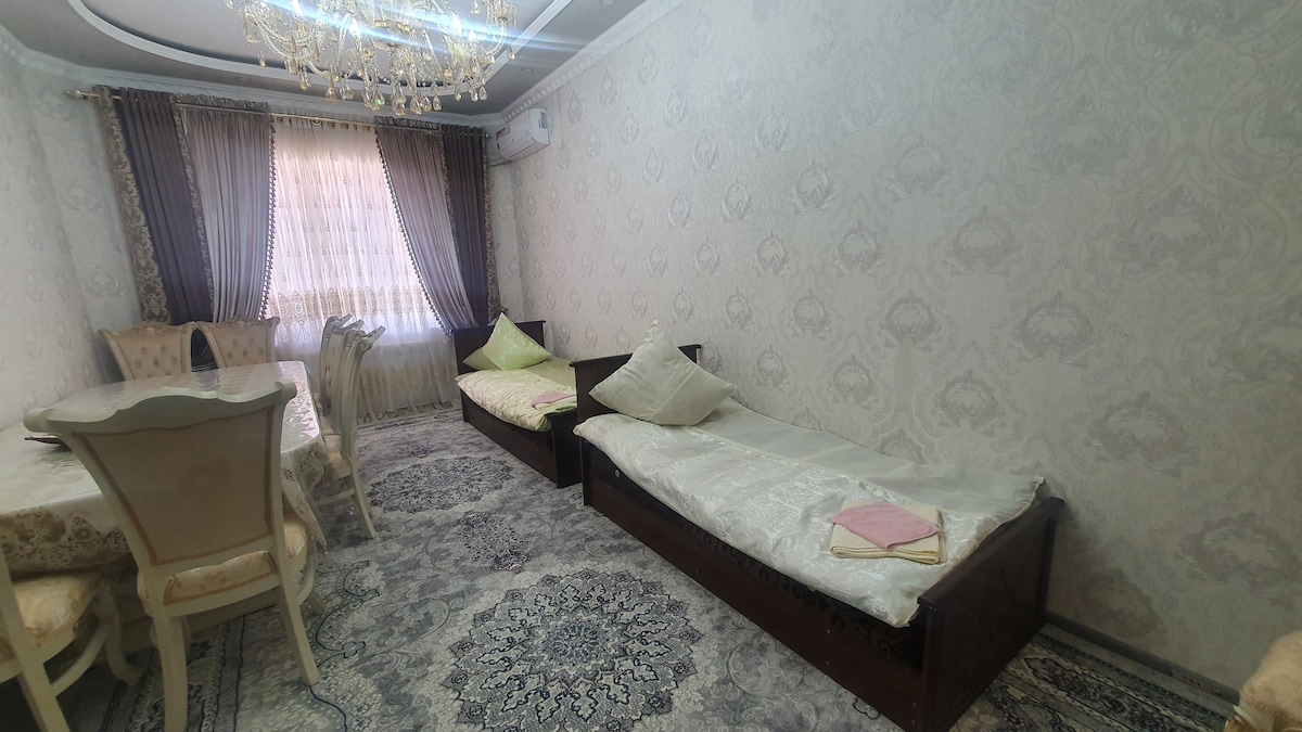 Well looked after 2 bedroom apartment, bright and clean. Quiet neighbourhood, family friendly. Comfortable beds, traditional Uzbek carpets throughout the apartment.