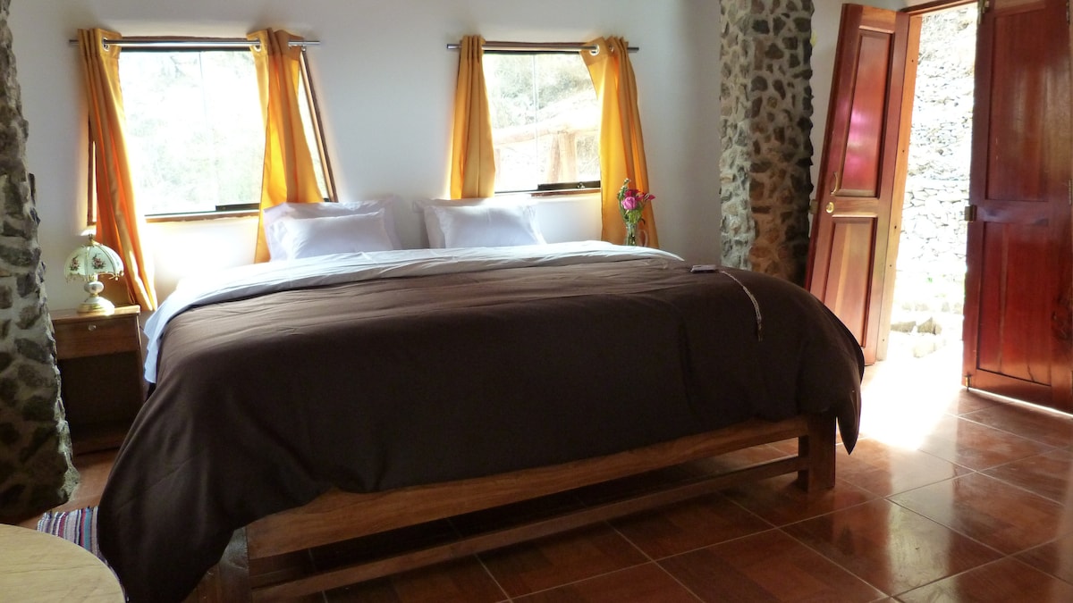 Room for rent in a all natural adobe house Comfortable Queen sized bed Private bathroom, private entrance and terrace A large garden with a splendid view over the valley Peaceful and quiet, on the mountainside, a 10 min walk from Taray + 5 min from Pisac with mototaxi. Mario will deal with your luggage WIFI, fully equipped kitchen, washing machine free of use, Reverse Osmosis filtered water and organic veggies from the garden Outdoor fire pit and indoor fireplace