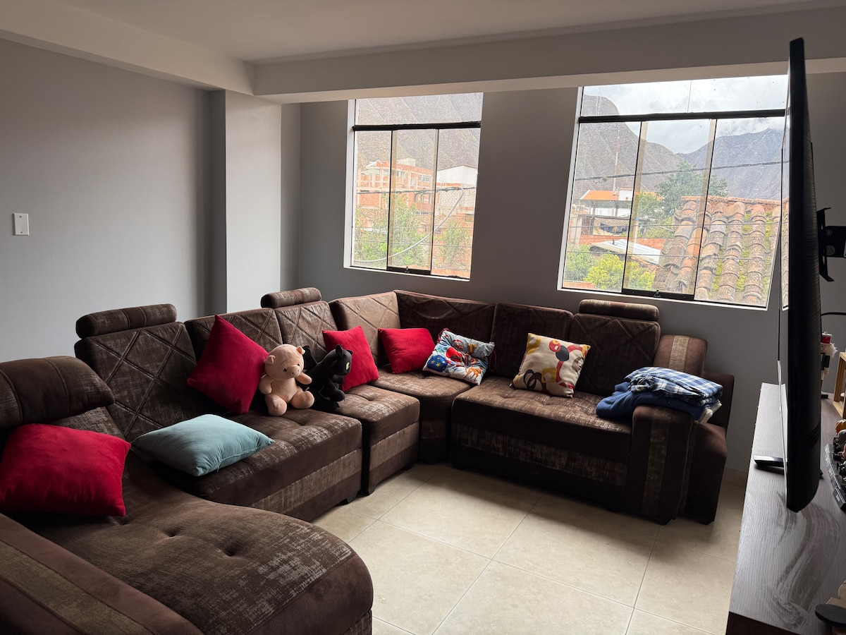 Disfruta de una experiencia acogedora y tranquila en este departamento de estreno y céntrico de la ciudad de Urubamba. Ubicado en el tercer piso, muy cerca de todo: minimarket, restaurantes, plaza de armas, etc. El departamento cuenta con muy buena iluminación, presenta una buena distribución de ambientes: dos dormitorios, comedor, cocina, sala, baño con ducha caliente las 24 horas, wifi, estacionamiento gratuito y una terraza pequeña para disfrutar de la maravillosa vista a las montañas.