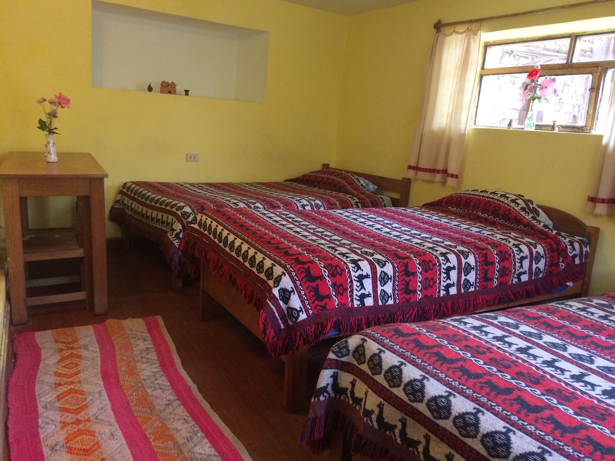 Welcome to our home! The rooms are comfortable and have a magnificent and wide view of the mountains. We have a great point of view. Our house is traditional from Ollantaytambo and it is a quiet area, it is located outside the city center in the Pakaritampu pyramid The house is shared with us as we live on site. The accommodation is good for couples, adventurers, business travelers, families (with children) IMPORTANT INFORMATION: we ask that you like animals, especially dogs, we have 5 at home.