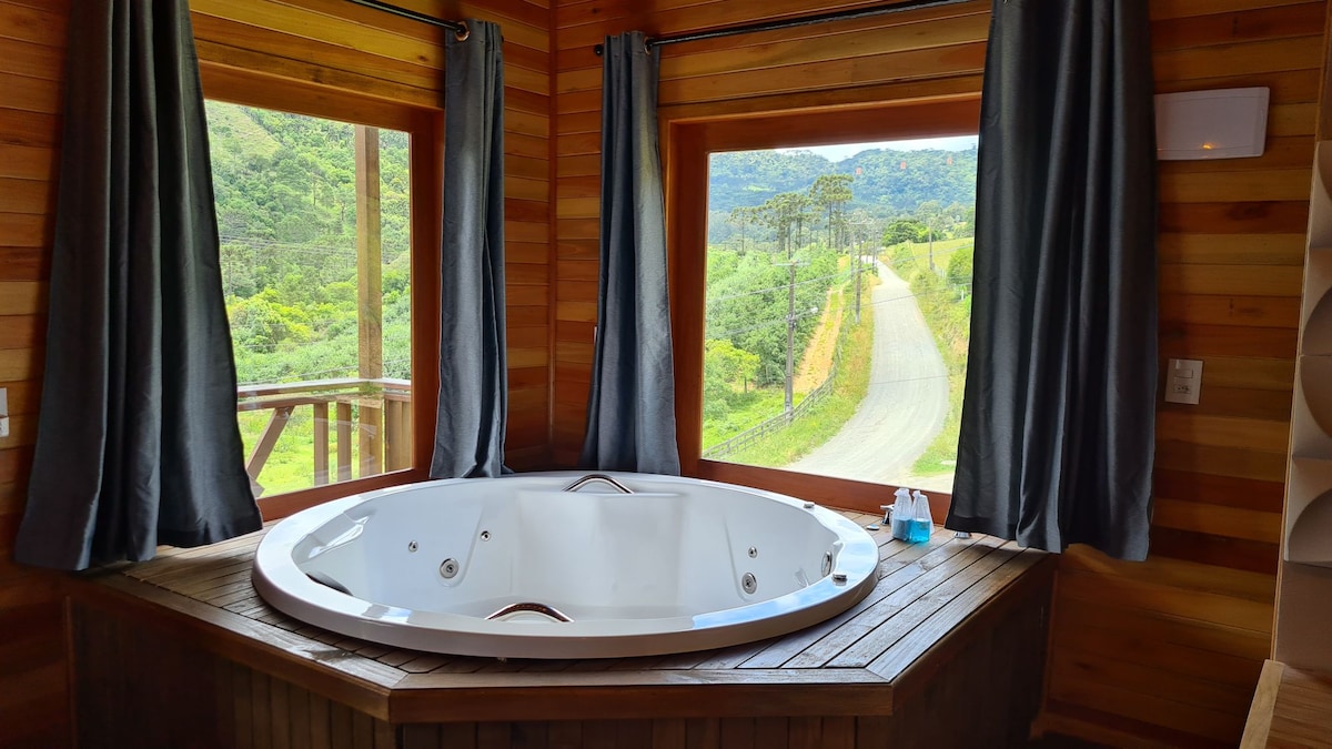 * Cama de casal no mezanino * Banheira dupla com hidromassagem * Sofá * Cozinha (fogão, pia, microondas, frigobar, pratos, talheres, taças, copos, xícaras, panelas, liquidificador) * Calefator a lenha * Ar condicionado * Chuveiro a gás * TV com IPTV * Wi-fi * Secador de cabelo * Roupa de cama e banho * Área externa com local para fogueira e picnic * Garagem coberta