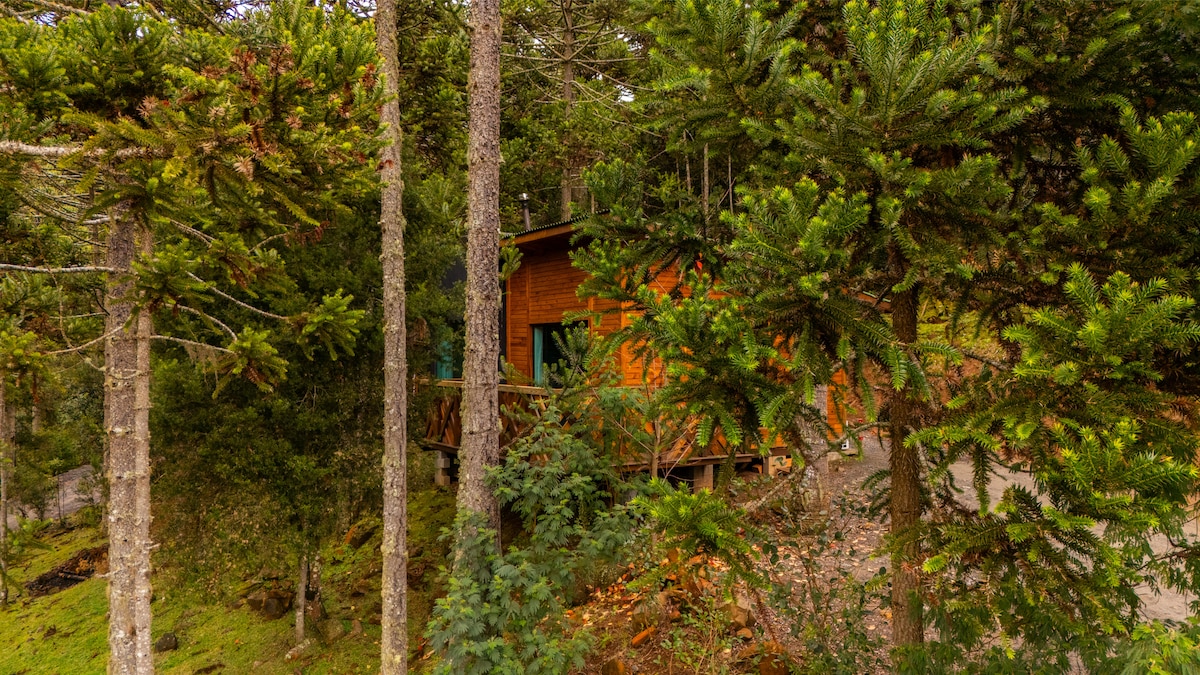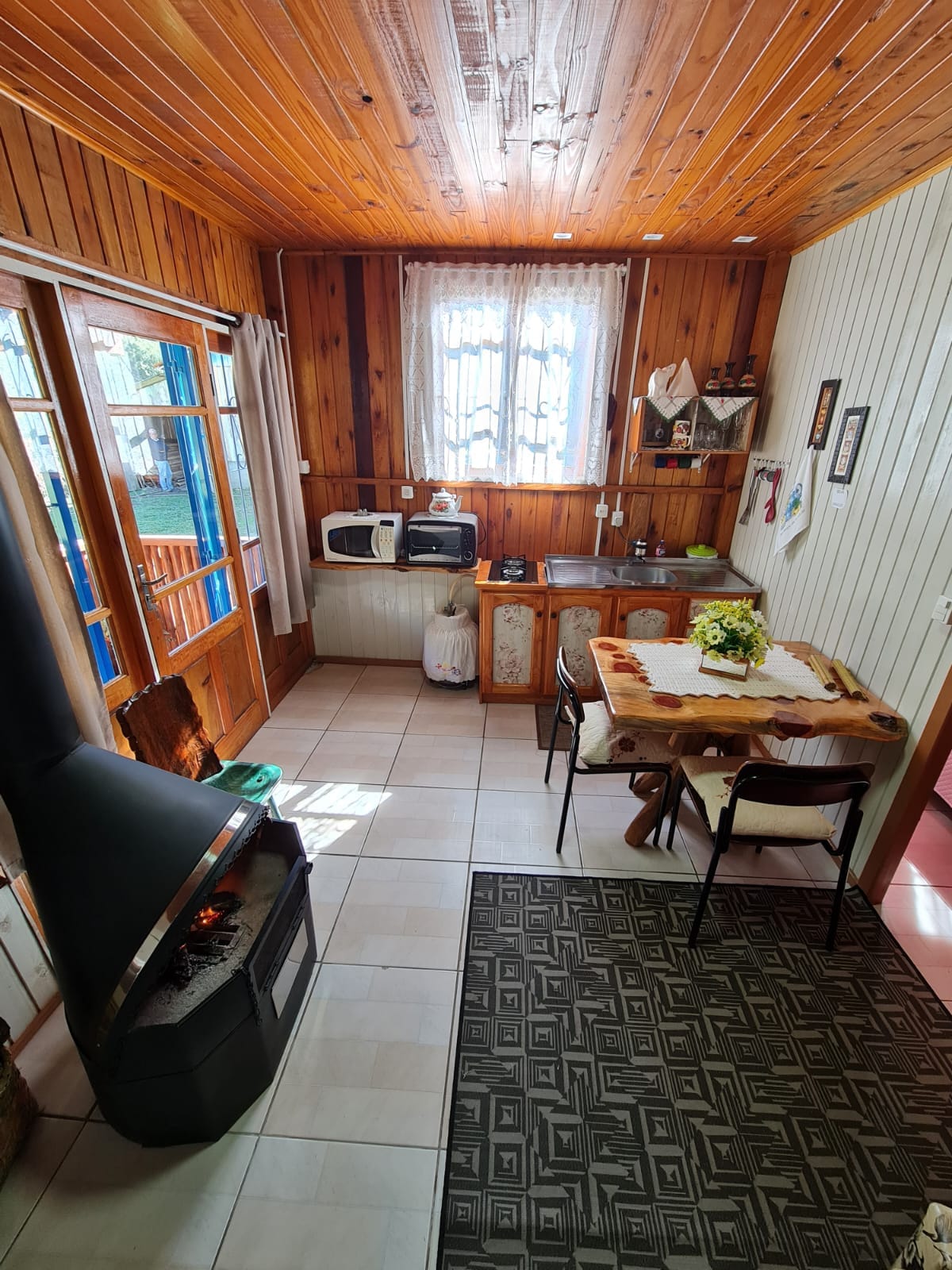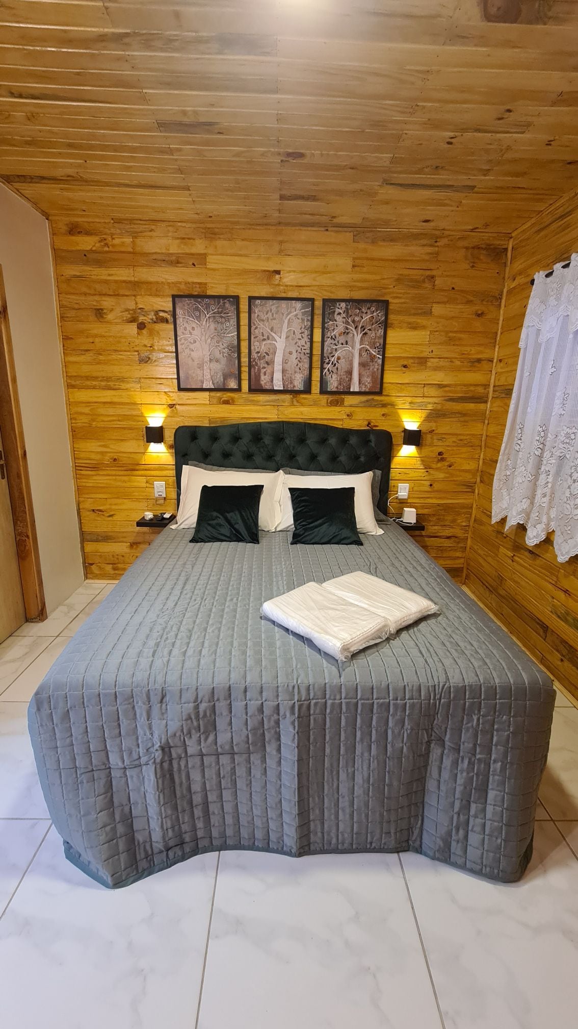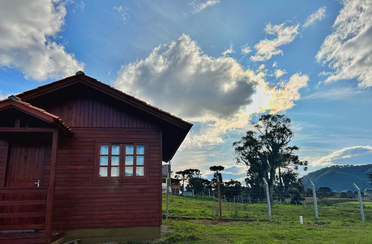É um chalé rústico, confortável e aconchegante para duas pessoas, eventualmente acompanhadas de uma criança ou pessoa jovem. Tem sala, cozinha e banheiro. O quarto de dormir (colchão Ema novíssimo) fica no mezanino. Um deck em torno do chalé completa o espaço, rodeado de verde da floresta de araucária e do jardim. Para conviver com o frio existe um calefator a lenha. Existe outra casa no terreno. O lugar fica a 10km da Esquina de Urubici, ou a 8,5 km do portal do Caminhos da Colônia.