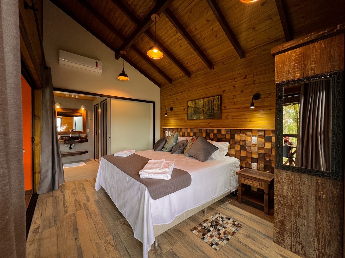 Cabanas de 82 m² com 2 suítes completas e confortáveis em um lugar sossegado na natureza, porem próximo 3 km do centro comercial e de plantações. Cozinha com geladeira, fogão, forno, micro-ondas, mesa de jantar, churrasqueira e todos os utensílios básicos de cozinha inclusive taças. Suítes com ar condicionado quente e frio, armários, roupas de cama e de banho Altenburg e vista para a natureza. Sala com sofá, televisão 32" com canais a cabo, Wi-fi de qualidade e calefator para aquecer.