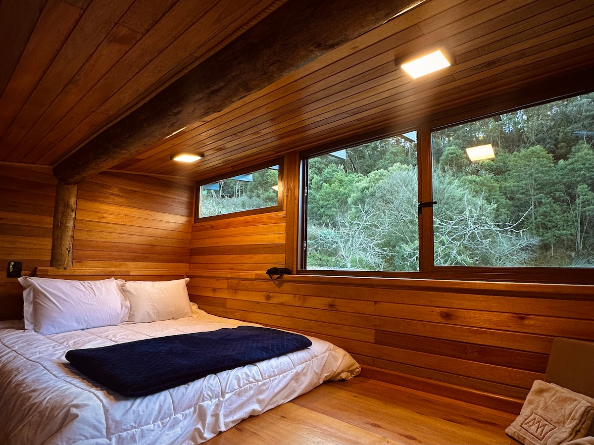 Refugie-se em um loft de madeira nas montanhas de Urubici, cercado por natureza, silêncio e uma vista marcante. Perfeito para casais, o espaço une conforto, privacidade e um clima acolhedor. O destaque é a banheira com vista para a mata, ideal para relaxar ao pôr do sol ou sob o céu estrelado da serra. O loft tem ambiente integrado, decoração rústica sofisticada e amplas janelas que trazem a natureza para dentro. A varanda convida a desacelerar.