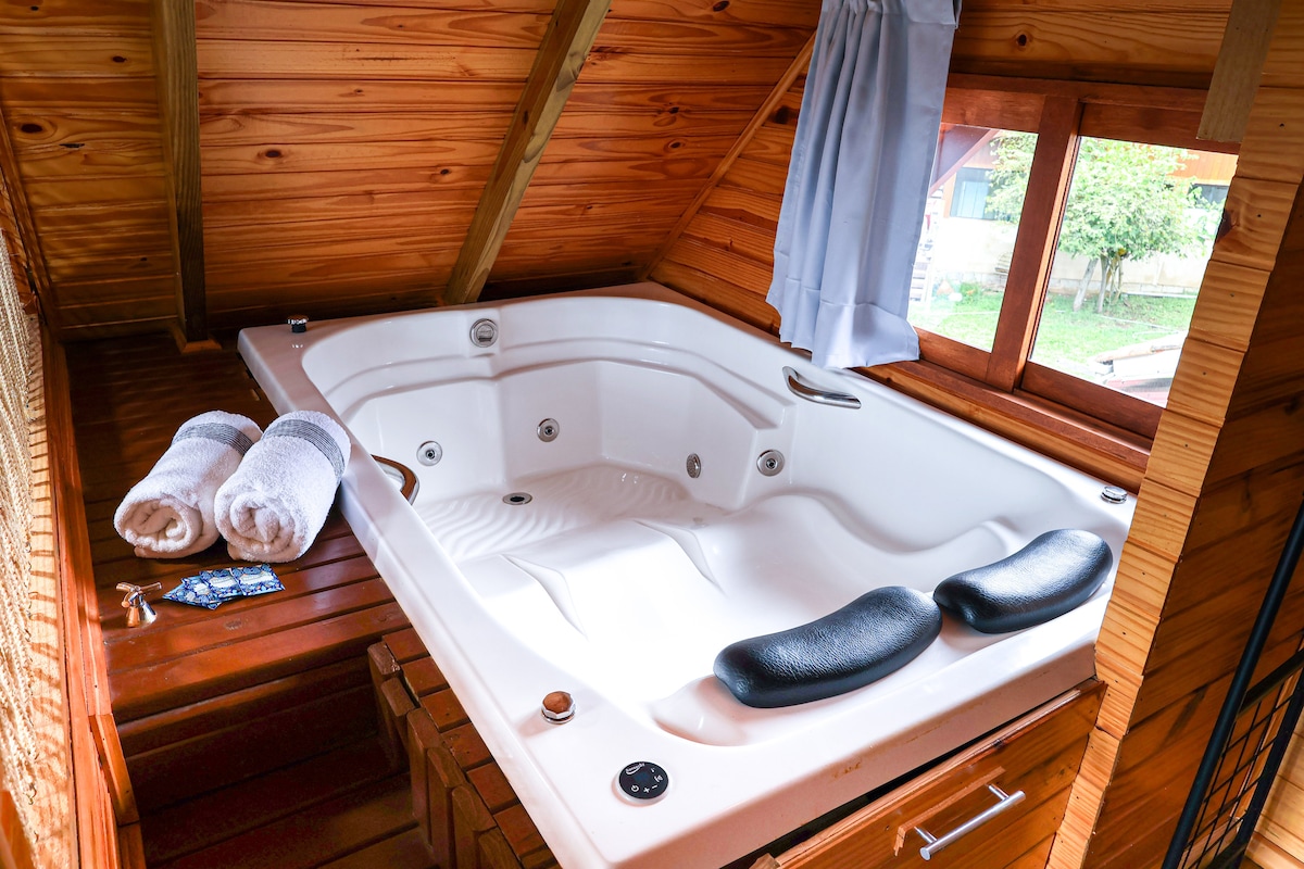 Desfrute de noites estreladas na nossa cabana com jacuzzi e fogo de chão. O mezanino é ideal para ler, meditar e apreciar a paisagem natural. Com uma vista preservada para o vale e quedas d'água no terreno, você poderá relaxar ao som da água corrente. A cabana oferece amplo espaço, cozinha equipada, geladeira com freezer, adega refrigerada e máquina de lava e seca. Para seu conforto, conta com calefator, ar condicionado, aquecedor de toalha e lençol térmico. A apenas 12 km do centro.