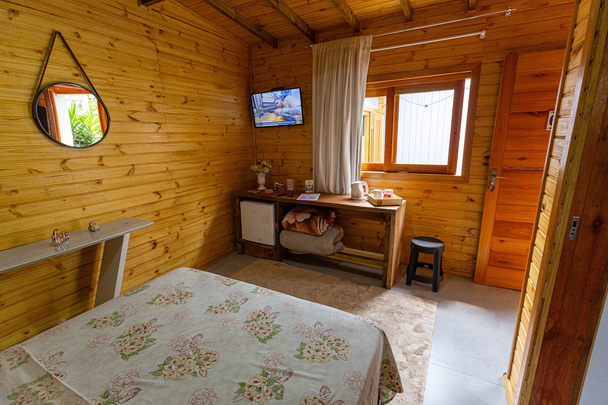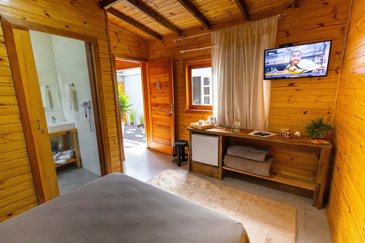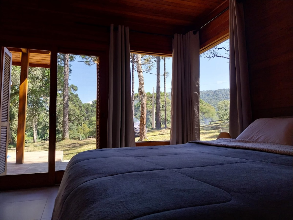 Conforto e tranquilidade para você e sua família aproveitarem. A Terra Luni conta com 1 suíte, 1 quarto com 2 camas de solteiro, sala de estar com lareira, cozinha completa e outro banheiro. Os quartos contam com ar-condicionado e disponibilizamos um colchão pra um quinto Hóspede. Na parte externa há um espaço com banheira e spa para os pés , fogo de chão, dois balanços, redário e um jardim gigante para apreciar a vista, em meio a natureza. Além de tudo isso somos pet friendly!