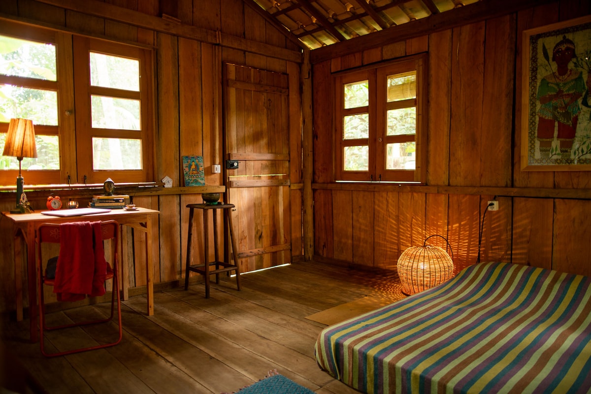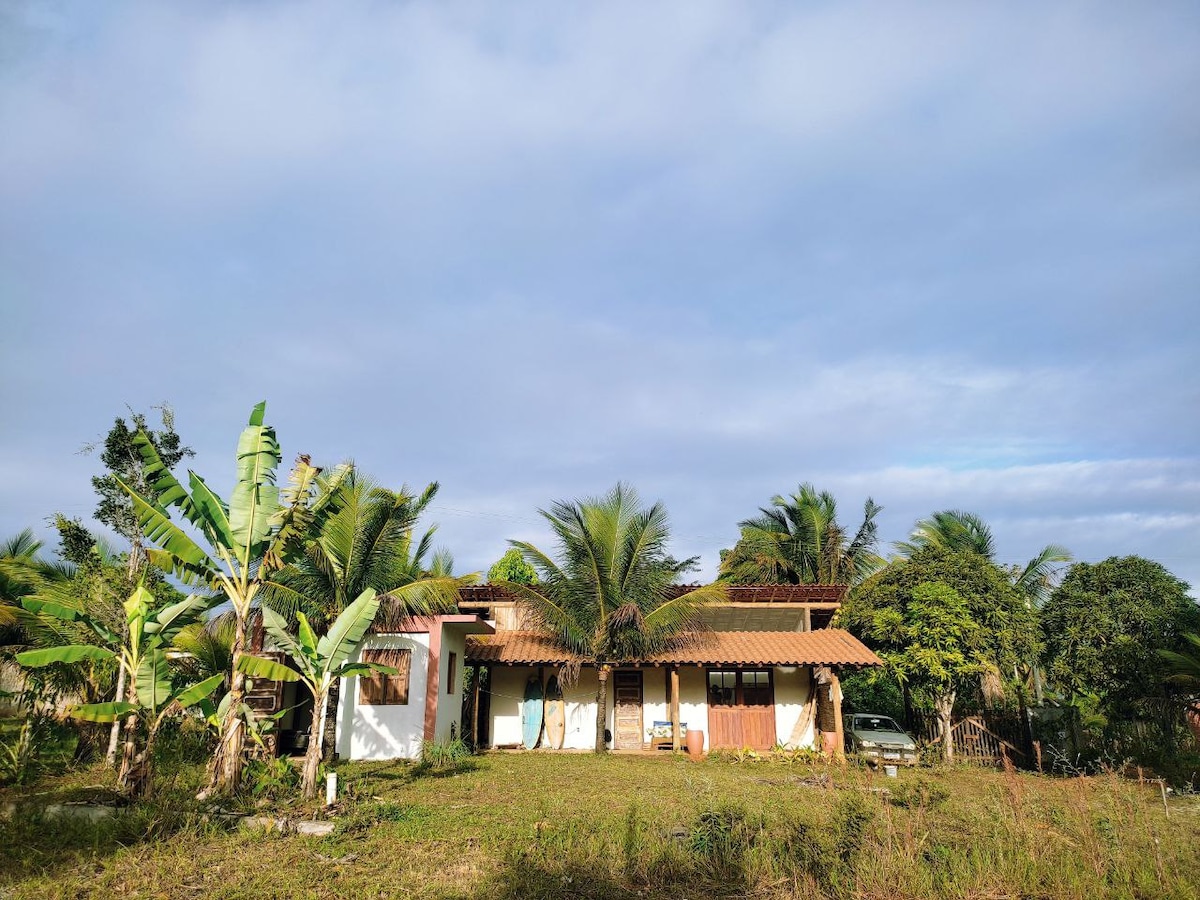 cabin charming wood with balconies and small library with books on nature and life. Wide landscape to the sea from the top of a mountain 100 meters to sea level. Peace and security, 2 km from the friendly village of Serra Grande. Refuge of wildlife: small primates, sloths, peccaries and anteaters. Region of traditional farmers of cocoa, cassava, coconut, and poultry farming. surf equipment, canoeing, cycling.