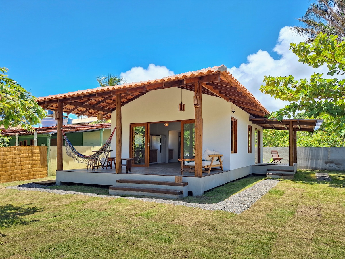 With direct access to the beach and air conditioner, this bangalo is a sophisticated version of a typical vernacular house usually seen in the country side of the tropical state of Bahia. Its improvements includes wide class doors, white floors and integrated cupboards and wardrobes. From the bed you can see the beach and sea beyond. The tropical garden hugs the house and supports the wild life of many birds' species. The wide unspoiled beach is just a few steps away, a very peaceful place.