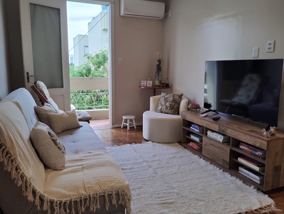 Apartamento completo, em área central da cidade Próximo à academia, farmácias, mercados, restaurantes! Possui 2 quartos, cozinha, sala, banheiro e varanda com churrasqueira. Contamos com 2 camas de casal e uma de solteiro, podendo assim hospedar até 5 pessoas. Um dos quartos tem ar condicionado. O apartamento possui garagem para 1 carro. Temos Wi-Fi.