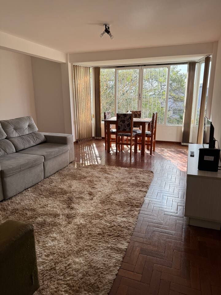 Apartamento completo, em área central da cidade Próximo à academia, farmácias, mercados, restaurantes! Possui 2 quartos, cozinha, sala, banheiro e varanda com churrasqueira. Contamos com 2 camas de casal e uma de solteiro, podendo assim hospedar até 5 pessoas. Um dos quartos tem ar condicionado. O apartamento possui garagem para 1 carro. Temos Wi-Fi.
