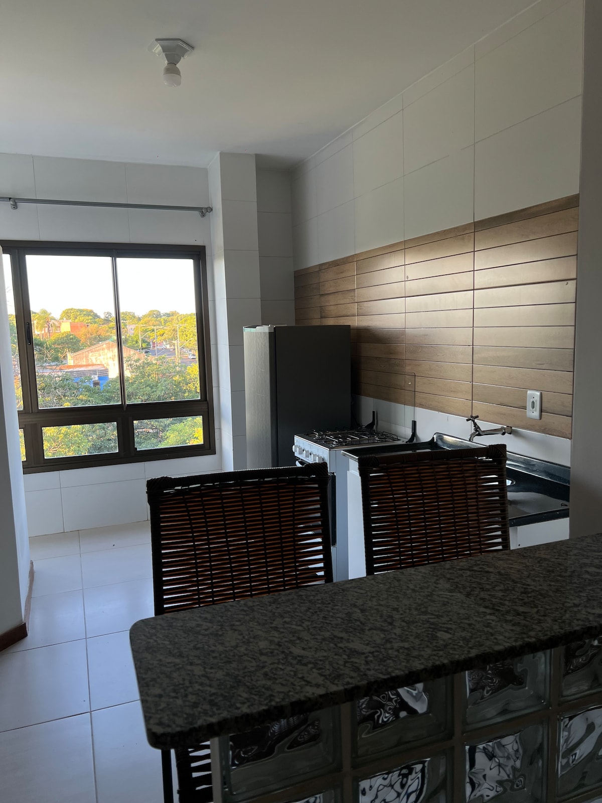 Apartamento novo, central em Uruguaiana muito aconchegante, com 1 dormitório, cama de casal, roupas de cama, ar condicionado. Sacada grande vista para frente, cozinha equipada com utensílios, microondas, chaleira elétrica, cafeteira, torradeira, louças. Próximo mercado, farmácia, 1 quadra do Parcão, 3 do terminal de ônibus.