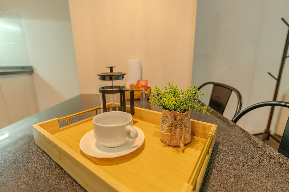 203 号单间公寓,配备加大双人床,紧邻 WTC 和购物中心。