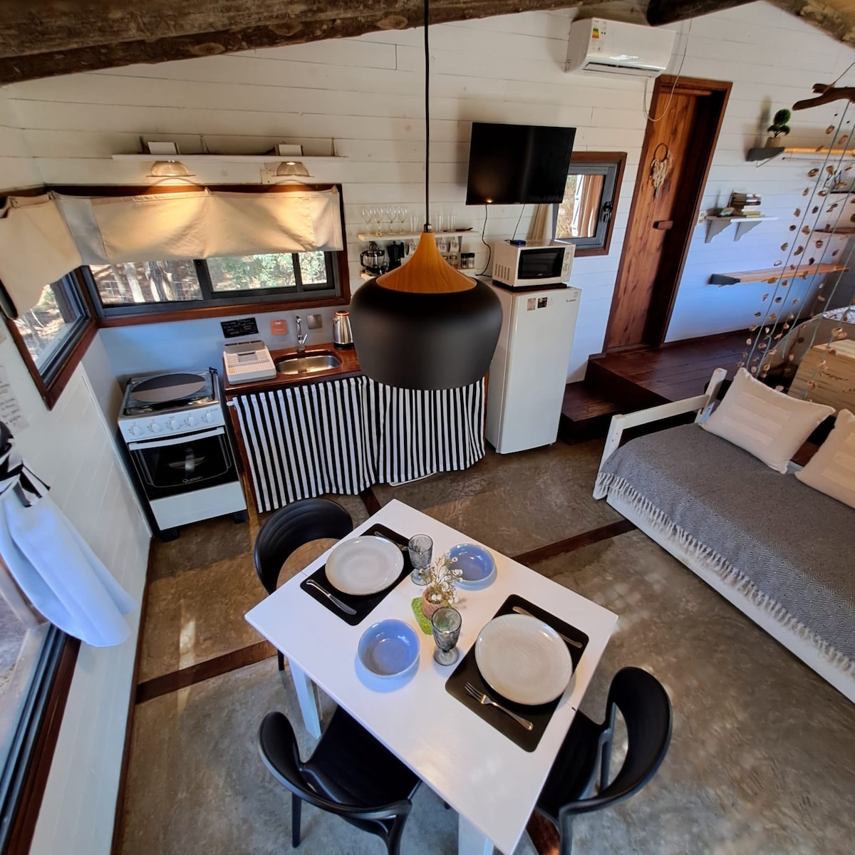Dos cabañas càlidas y acogedoras, con diseño cuidado y objetos de decoraciòn ùnicos. Ubicadas en un entorno de bosque de pinos, para hasta 4 personas (pueden ser hasta 3 adultos y un niño o 2 adultos 2 niños) con todas las comodidades para disfrutar y descansar. Se ofrece seguridad y atenciòn especial ya que sus dueñas viven en el complejo. El servicio de WIFI por fibra òptica. Las cabañas poseen alarma con monitoreo.Estamos a 5m en auto de las playas más lindas de Punta del Diablo