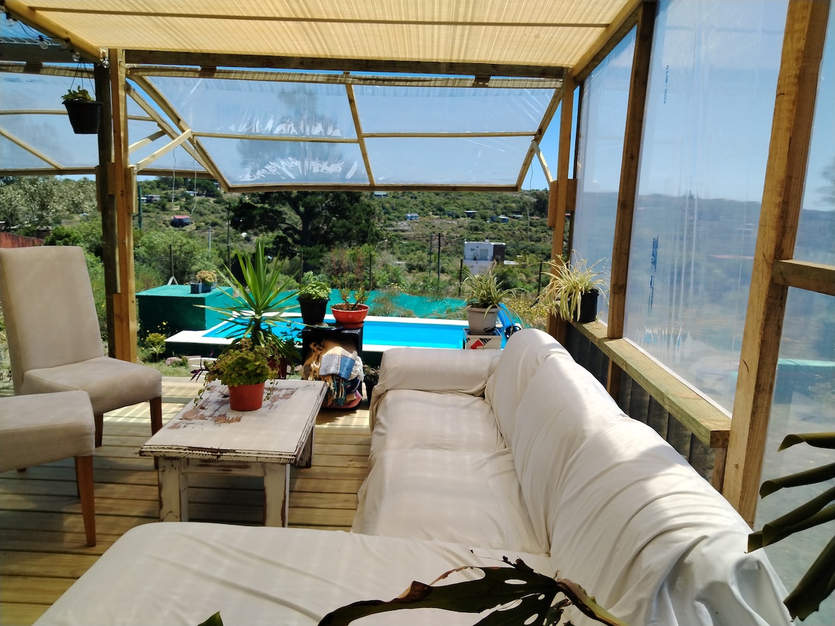 Es un hermoso lugar donde podrás disfrutar de la piscina climatizada todo el año, pasar momentos de paz rodeado de vegetación autóctona, vistas a las sierras que rodean la zona, disfrutar de las estrellas, los animales silvestres además de las comodidades que presenta la casa, agua, luz, baño privado, cocina y hermosa iluminación natural. Estas características y muchísimas cosas más que irás descubriendo, harán de tu estadía un momento único e inolvidable en contacto directo con la naturaleza.