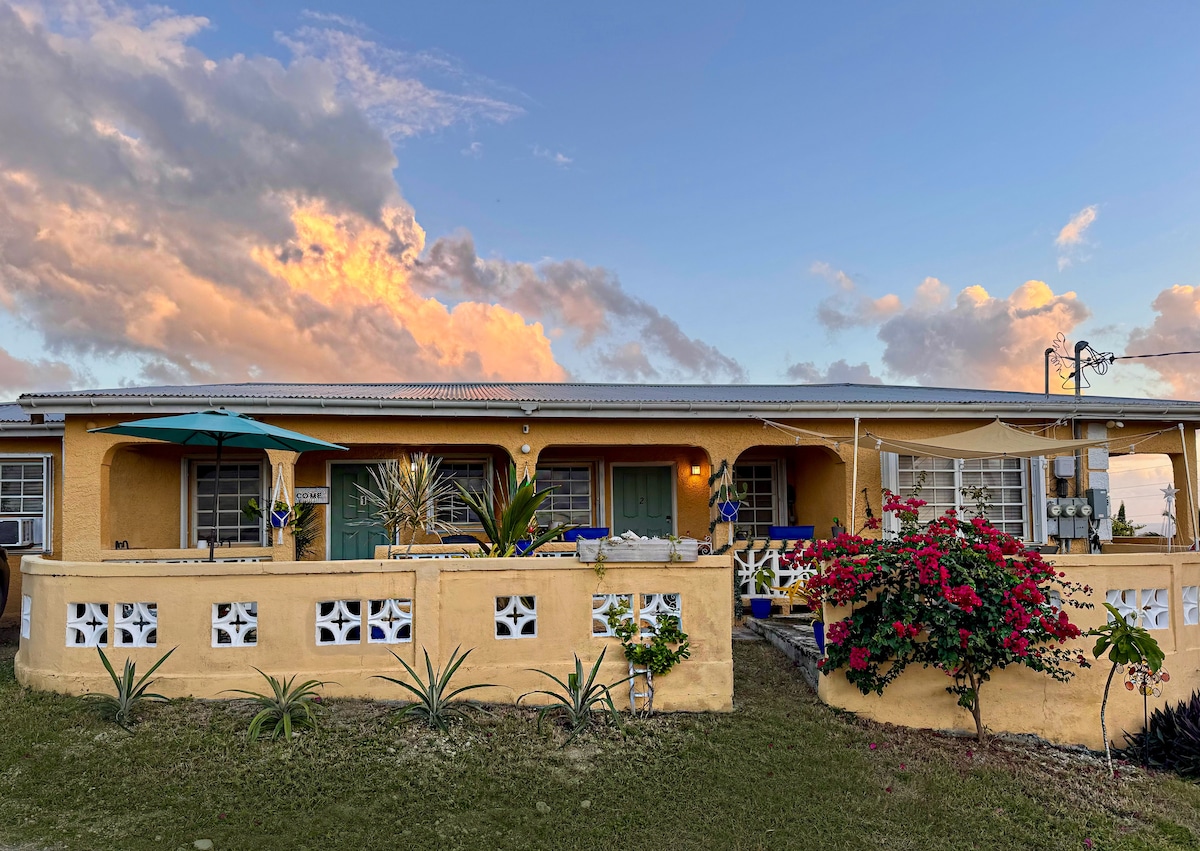 Beautiful 2BR/1BA townhome in central St. Croix with AC, parking, and sunset views. Enjoy a fully equipped kitchen with modern appliances, air fryer, coffee bar with espresso machine, plus a dining area for four. The primary bedroom features a queen bed, while the second offers two twins—perfect for families or groups. Relax on the front patio with seating, a grill, and stunning sunsets. Just 10 minutes to Christiansted, with easy access to beaches, dining, and island adventures. Dog friendly!