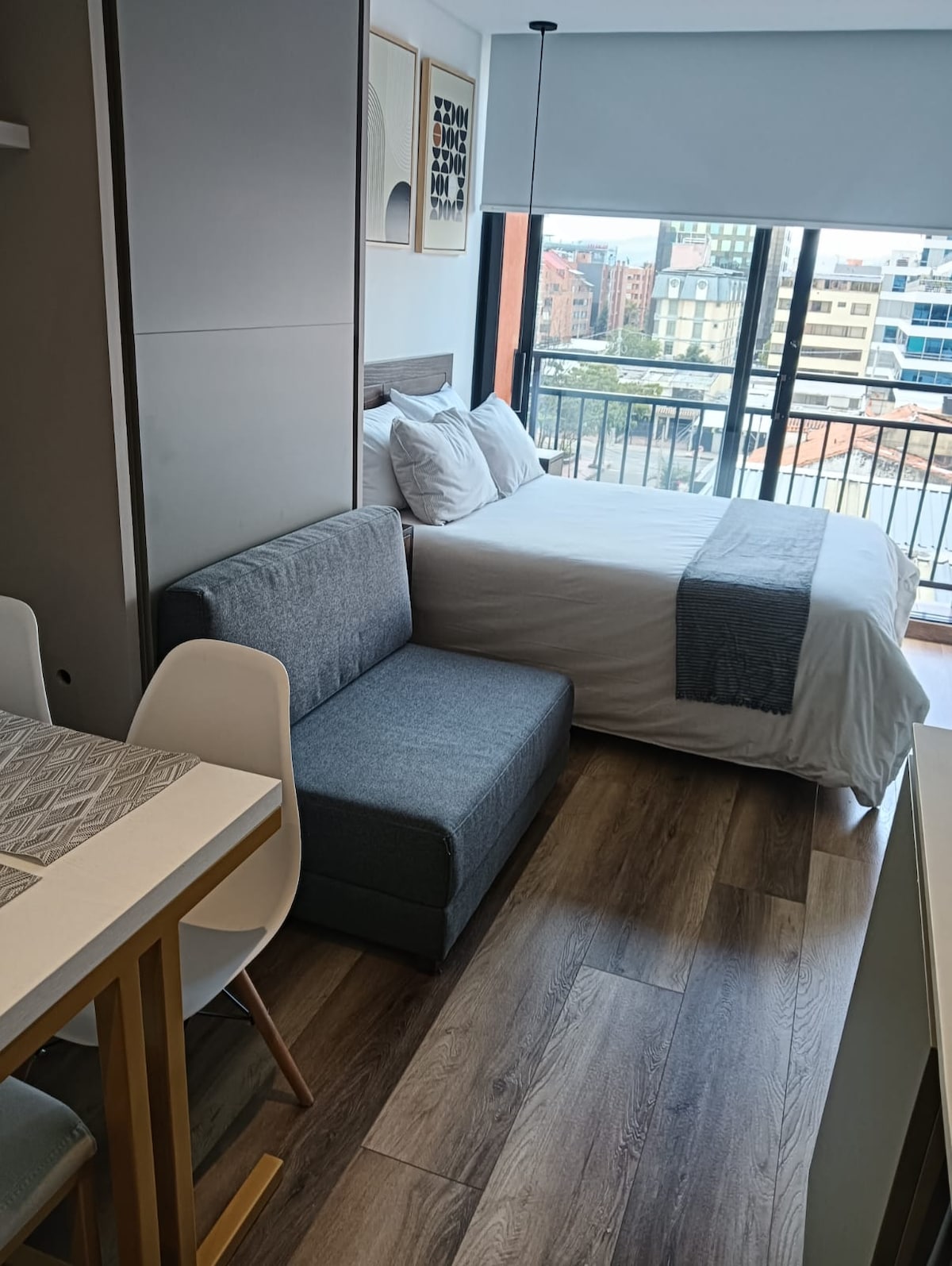 Enjoy a peaceful stay in this charming Bogota studio. It features a double bed and a foldable bed, a private bathroom with a dedicated walk-in shower, and a fully equipped open-plan kitchen to make you feel at home. Includes a private washer-dryer, a dining table for four, and all necessary utensils. Guests have access to premium common areas such as a coworking space, gym, dining zone, billiards, ping-pong, jacuzzi, and a beautiful event lounge. Just a few minutes’ walk from Parque 93