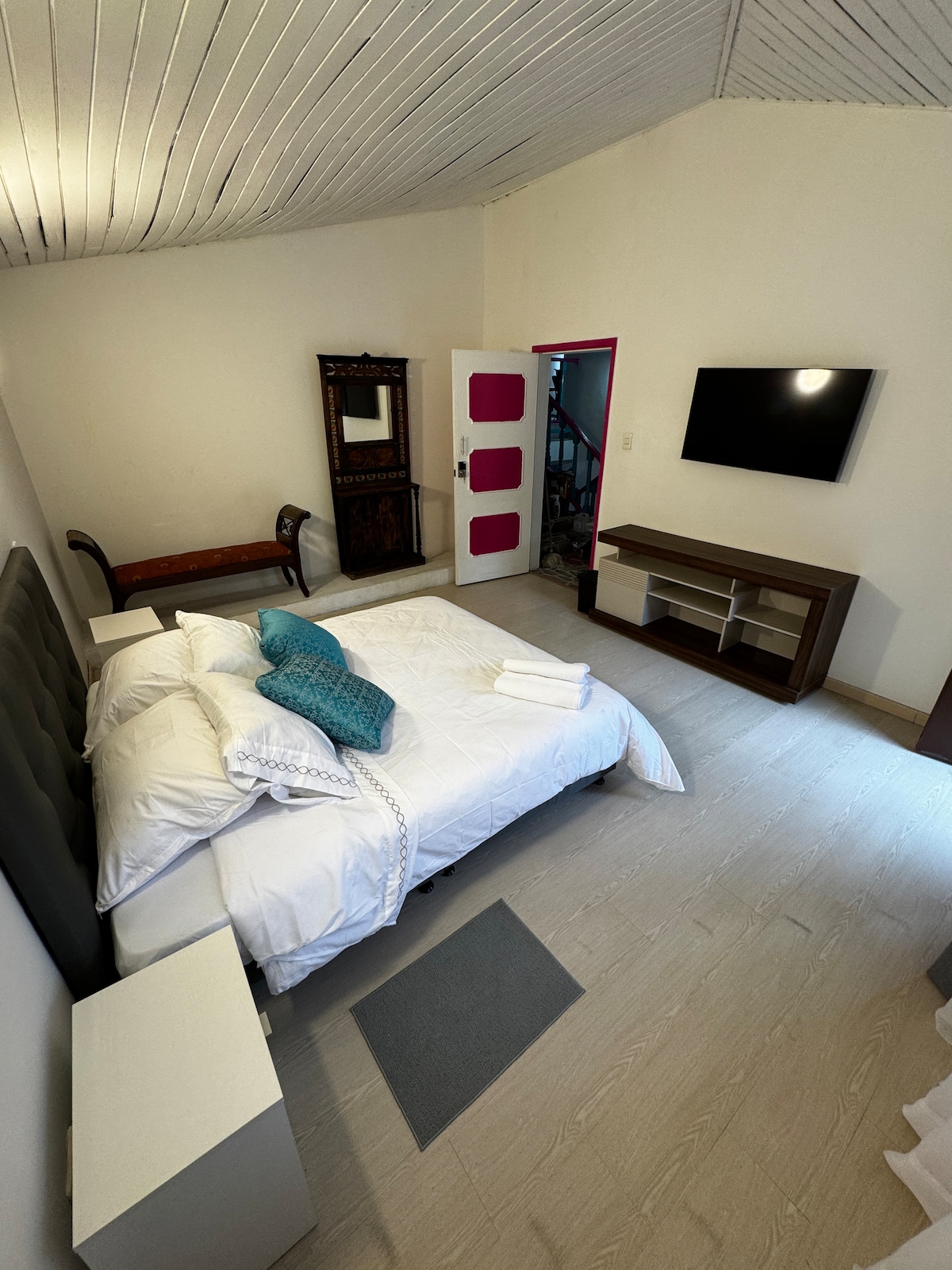 Este acogedor apartaestudio es de uso exclusivo, independiente y privado consta de una habitación amplia, con una cama doble, TV, clóset y mesa de escritorio, baño con agua caliente y una cocineta con nevera la cual tiene lo necesario para cocinar como ollas, loza, cubiertos y otros adicionales. El apartaestudio se encuentra ubicado en la parte de atras de la casa principal, por lo que la entrada es compartida entre ambos. El apartaestudio tiene una buena iluminación, es muy limpio y acogedor