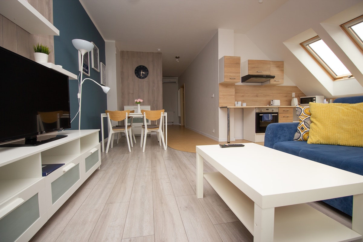 Mieszkanie mierzy ponad 50 m2 i zostało podzielone na salon z aneksem kuchennym, dwie sypialnie oraz łazienkę z prysznicem. Aranżacja wnętrz zapewnia, że każdy Gość będzie czuł się tutaj jak w domu. Apartament charakteryzuje się jasnym wystrojem wnętrz oraz zaciszną atmosferą, jest klimatyzowany. W pierwszej oddzielonej sypialni znajdą Państwo wygodne łóżko o wymiarach 140×200. W drugiej sypialni znajduje się wygodny rozkładany narożnik.