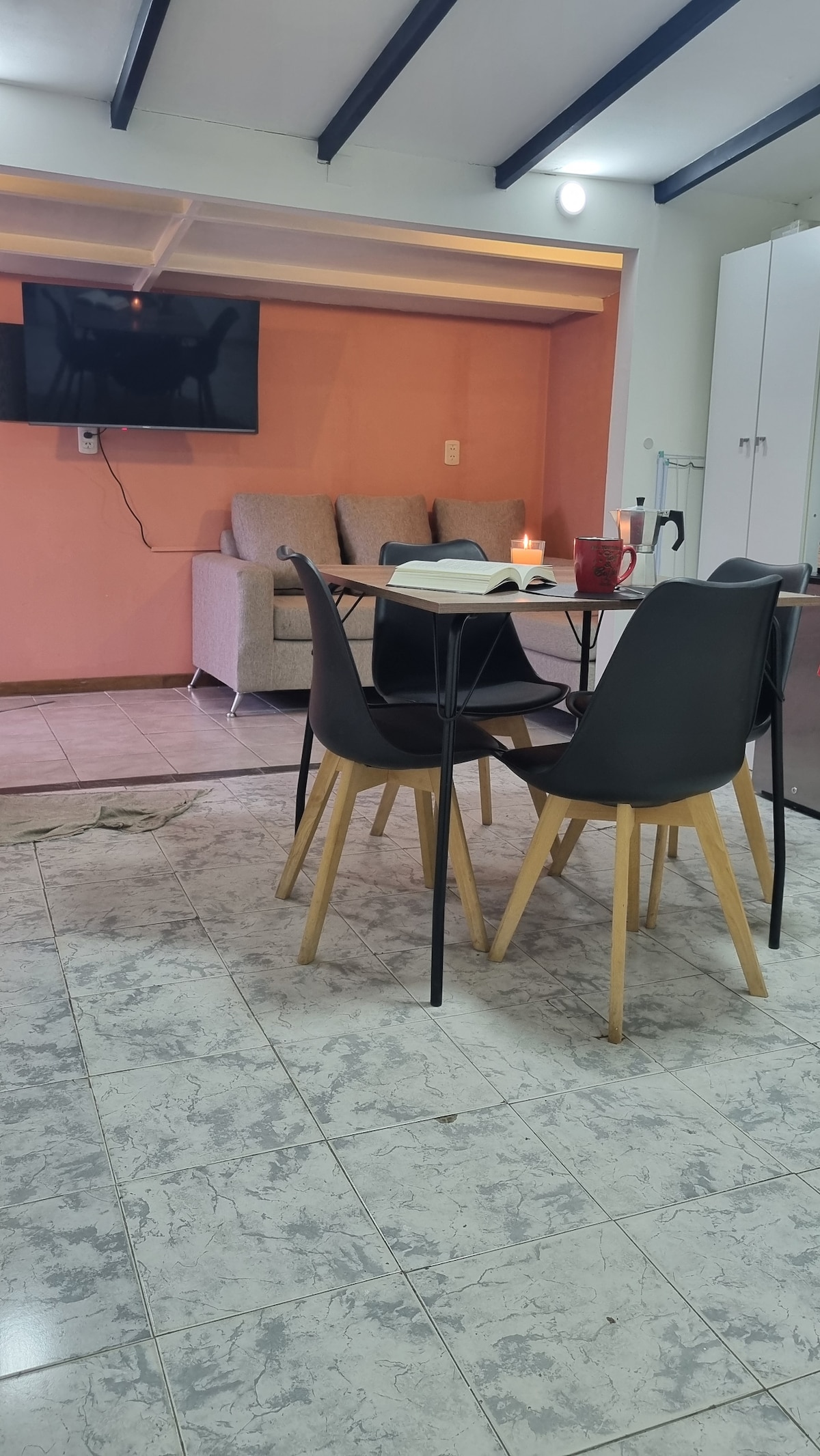 El dormitorio tiene una cama queen con la posibilidad de separarse en dos camas individuales. Cuenta además con placard para poder guardar pertenencias y cortinas blackout. La cocina está equipada para poder cocinar durante la estadía y vinculada con el área del living comedor. El living cuenta además con un sofá cama de 1,40 y una Smart tv. La calefacción es central mediante radiadores, lo que brinda una temperatura agradable durante los meses más fríos.