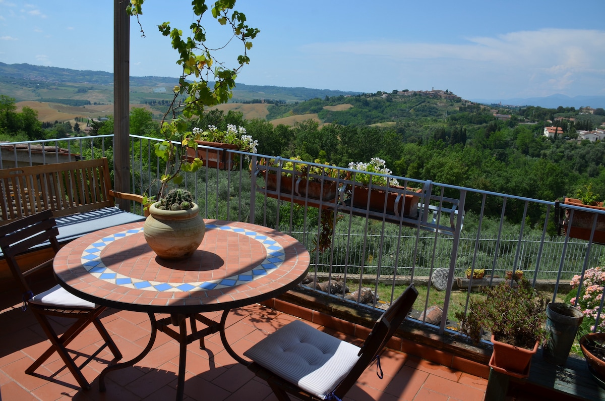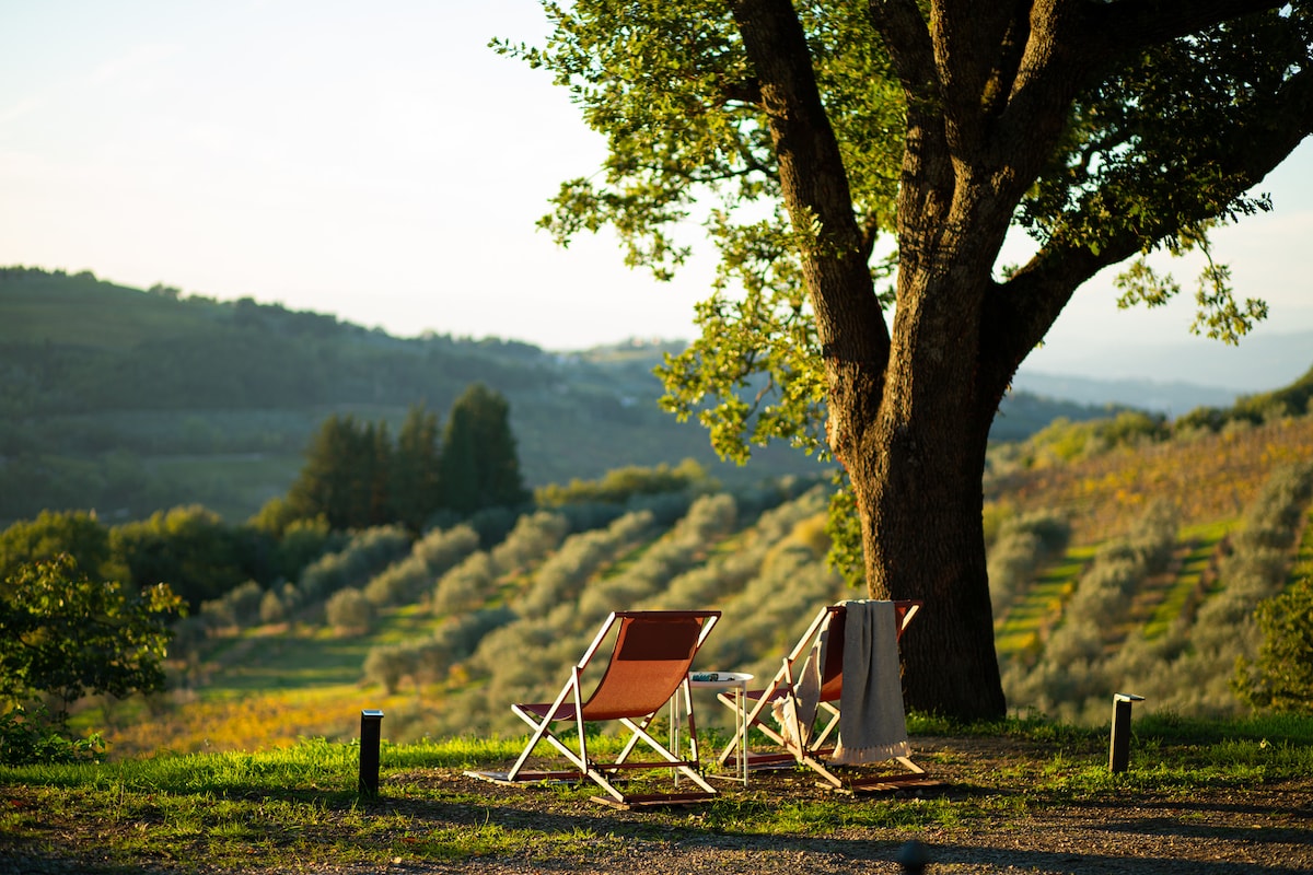 Immagina di svegliarti con le colline ornate di borghi e campanili a perdita d'occhio oltre la finestra della camera da letto: un'alcova con soffitti spioventi, travi e travicelli, pavimento in legno, in cima ad un antico casolare. Immagina da ogni affaccio della casa il sole che splende sulle vigne, oppure immagina il verde acceso degli uliveti dopo la pioggia primaverile oltre la grande terrazza adiacente alla cucina.