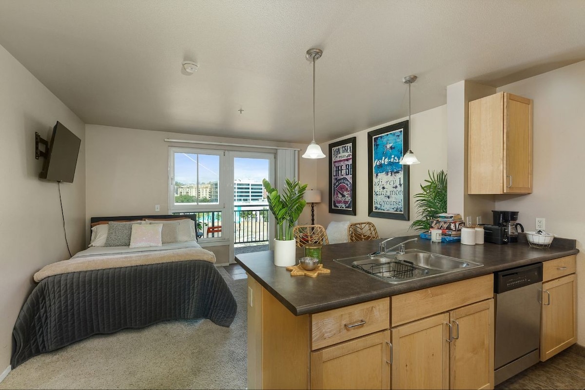 Large studio with comfortable queen sized Murphy Bed, a love seat, private entrance and private bath. Located in Cortez Hill - walk to the nicest neighborhoods in downtown like Little Italy, Gaslamp, East Village, and the Embarcadero. There is no full kitchen, but there is a small refrigerator, small microwave, and a pot for heating water. This is an ideal space for solo travelers, couples, events at the Convention Center, Padres Games, great eateries, and the best of Downtown San Diego.