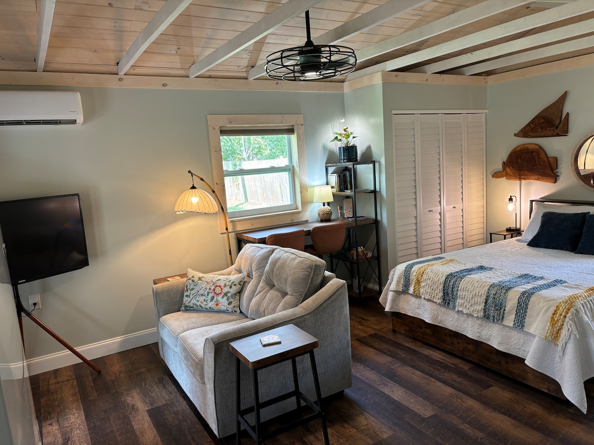 Escape to our updated Florida-themed studio, now featuring a private outdoor shower and tub —perfect for a good soak after hours of travel! Full kitchen, new furnishings and local Florida artwork. Enjoy rocket launches, beautiful sunsets by the river (1 block away), and quick access to Cocoa Beach, Cocoa Village, and Kennedy Space Center. Just 15 minutes from Port Canaveral if you’re in need of a landing pad before or after your cruise. Relax, recharge, and treat yourself to peaceful comfort!