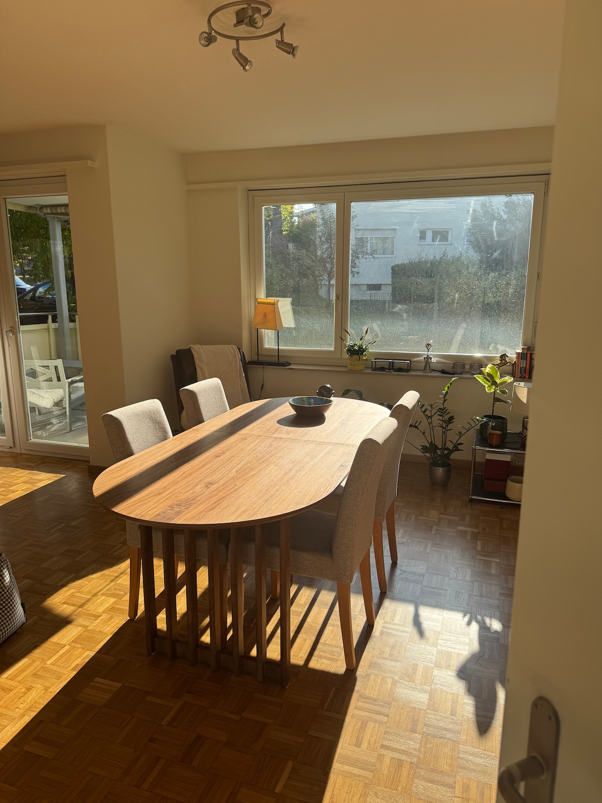 Unser Studio befindet sich im unteren Teil des Hauses und ist über einen separaten Eingang in der Garage zugänglich. Für genügend Stauraum sorgt der grosse Einbauschrank. Die Küche ist mit modernster Technik (Kochfeld, Backofen, Geschirrspüler, Kaffeemaschine) ausgestattet. Das Badezimmer mit Dusche, Sauna und Kälte Bad rundet die Einrichtung ab. Das WC ist separat. Zum Studio gehört ein grosszügiger Garten mit einem kleinen Esstisch und einer gemütlichen Lounge.