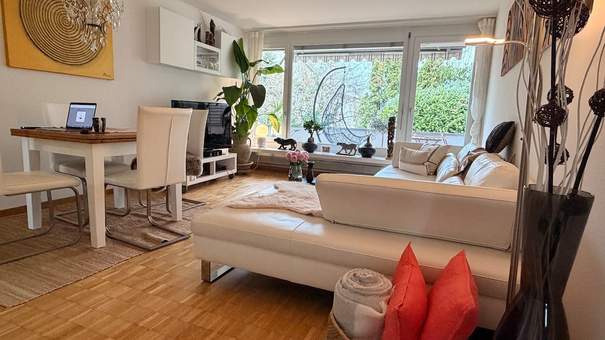 Relax with your partner or family at this peaceful place. Is a small paradise near the edge of the forest/stream in the green, quiet neighborhood of single-family houses. The 2.5 room apartment is located in a bungalow with 80s charm. The house has a driveway and is therefore away from the road, which is used only by residents. Sometimes deer, squirrels and other wild animals can be observed in the summer. There are two garden sitting areas. The house is only 20 min. from Zurich city by car.