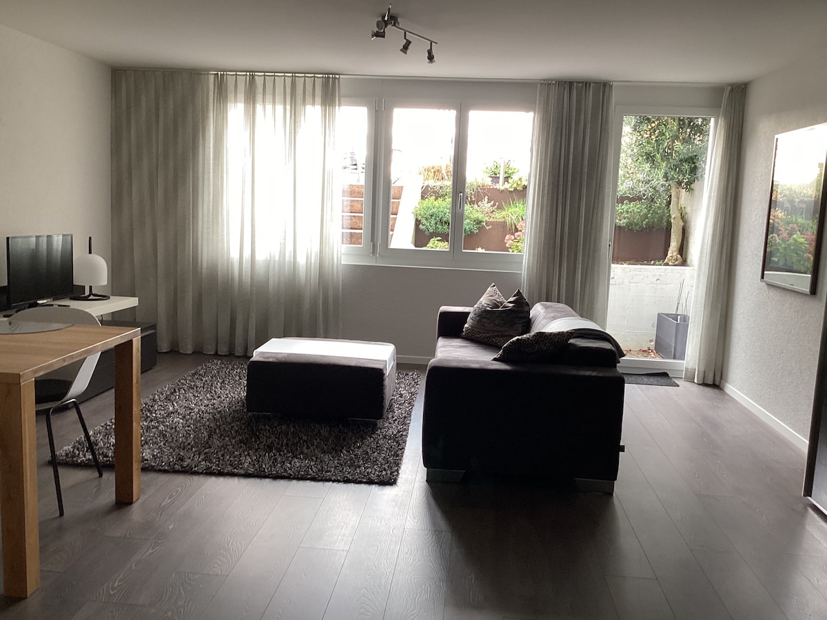 Relax with your partner or family at this peaceful place. Is a small paradise near the edge of the forest/stream in the green, quiet neighborhood of single-family houses. The 2.5 room apartment is located in a bungalow with 80s charm. The house has a driveway and is therefore away from the road, which is used only by residents. Sometimes deer, squirrels and other wild animals can be observed in the summer. There are two garden sitting areas. The house is only 20 min. from Zurich city by car.