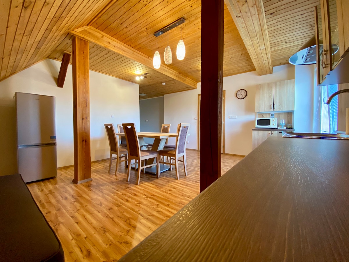 Toto podkrovní ubytování se nachází v klidné vesnici Vraný, přímo na kraji lesa. Nabízí naprosté soukromí díky samostatnému vchodu a celé ploše 120 m² jen pro vás. Apartmán je plně vybavený, prostorný a ideální jak pro přespání na cestách, tak pro víkendový útěk z města. Díky útulnému dřevěnému interiéru, tichému okolí a výhledu na přírodu se zde hosté cítí uvolněně a doma. Ráno můžete vyrazit na cyklovýlet nebo houby, odpoledne si odpočinout u kávy a večer užít klid bez jakéhokoliv rušení.