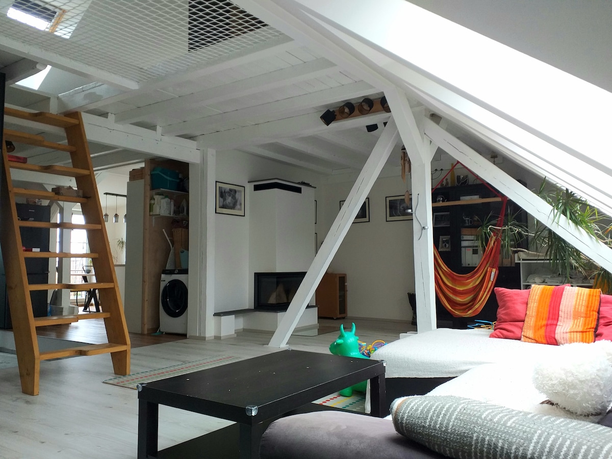 UN LOFT ROMANTIQUE AVEC JARDIN Profitez de l'espace : un loft moderne de 80m2, 7m de hauteur sous plafond, des grandes baies vitrées ouvrant sur le jardin. Prenez votre petit déjeuner à l'extérieur sur la terrasse en bois face aux bambous, aux arbres et aux milliers de fleurs du jardin - tulipes, hortensias, jonquilles, jacinthes,... Cet endroit a une histoire : sous le régime communiste, le jardin était la cour d'une école.